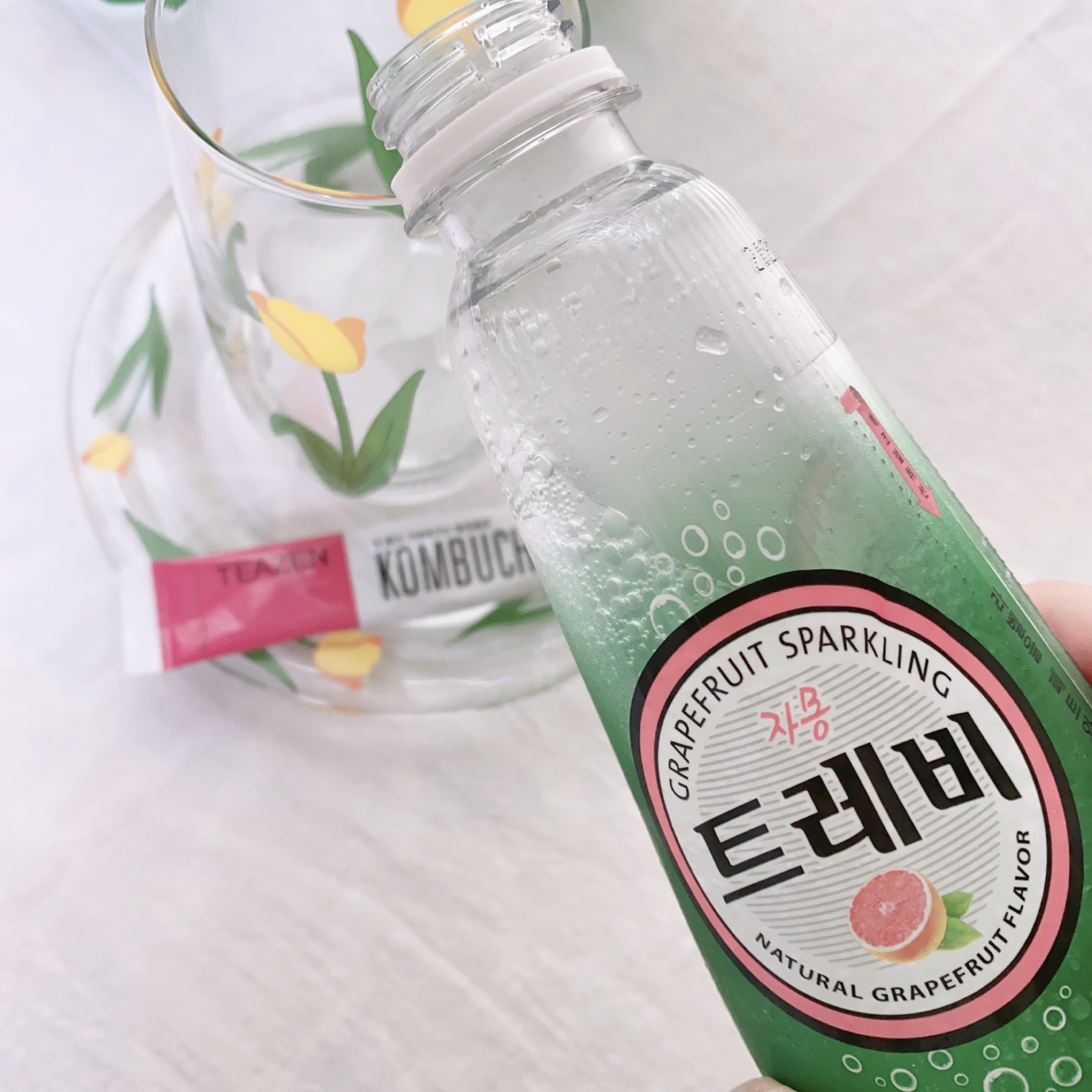 언니가 준 티젠 콤부차에 트레비 자몽맛을 타먹을 건데