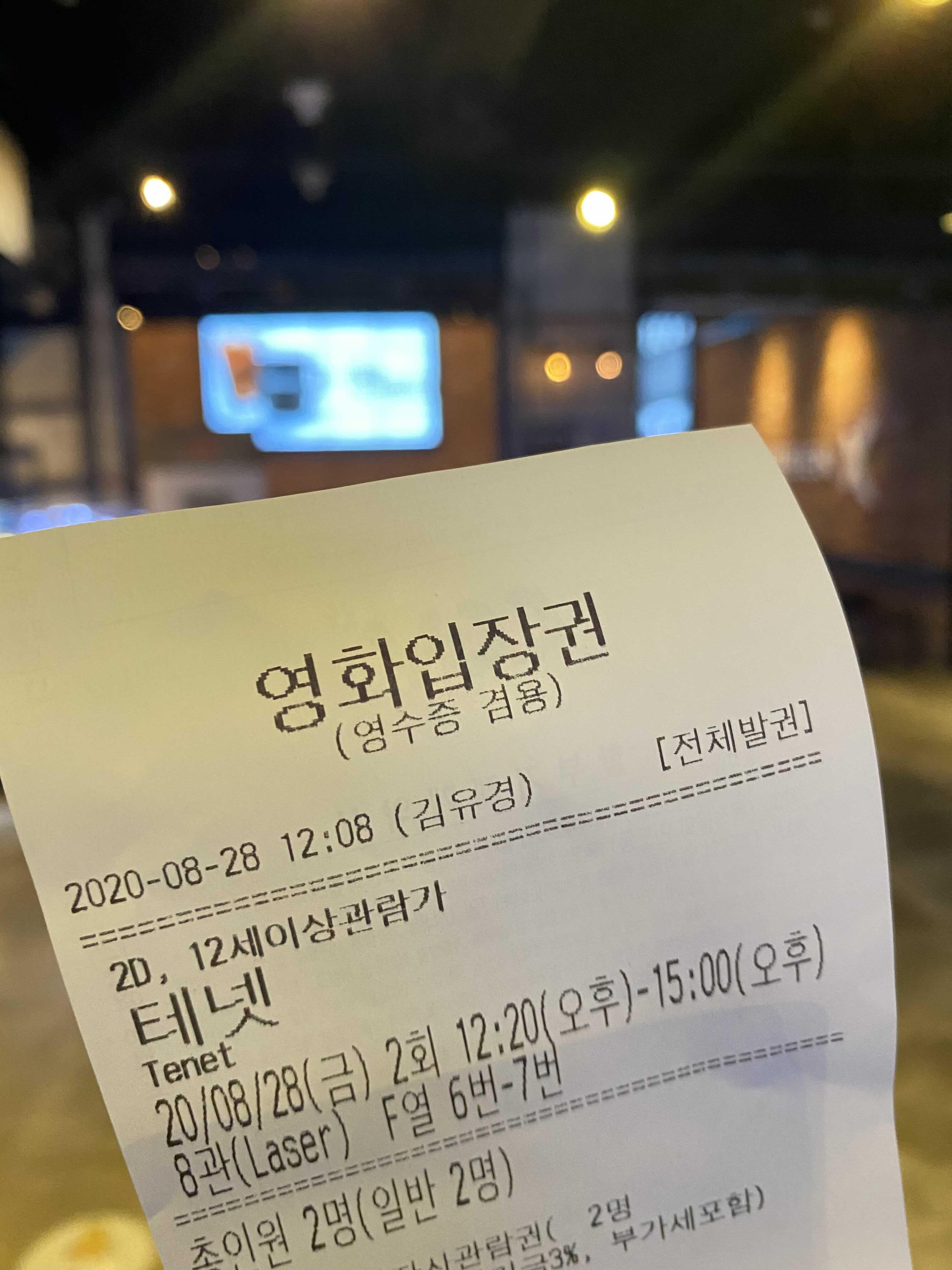 8/28에 본 영화 테넷입니다. 온통 테넷 만 상영중이라 사전 지식도 없이 본건데, 보기 전에 좀 영화에 대한 글좀 읽어보고 들어갈 걸 그랬습니다. 왜냐면 영화를 보는데 이해가 도통 되질 않았습니다. 제가 이해하기엔 너무 어려운 영화인가 했는데 같이 본 다람이도 어렵다고 했습니다.. 그치만 다람이는 저보다 많이 이해한 것 같습니다 ㅠㅠ ㅋㅋ