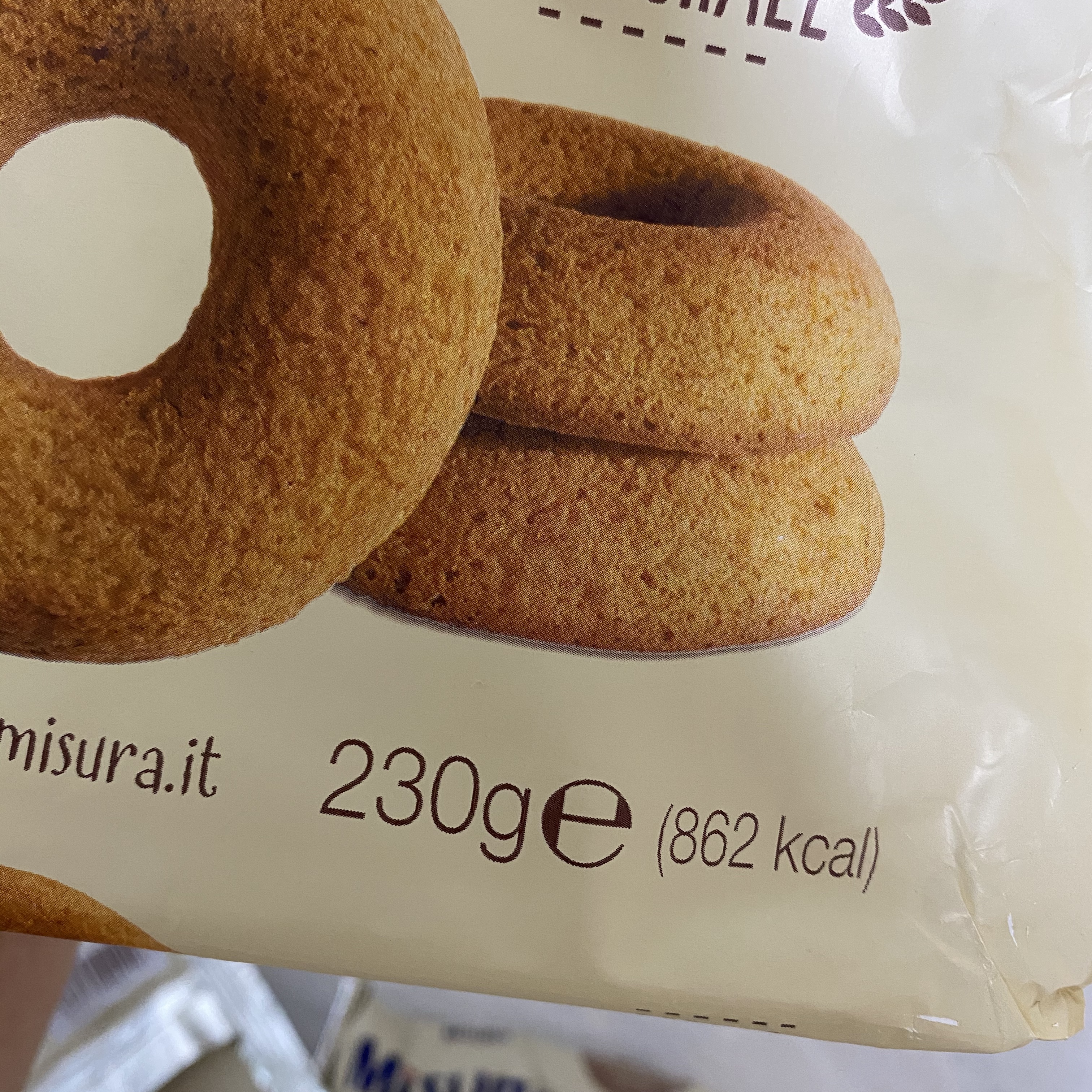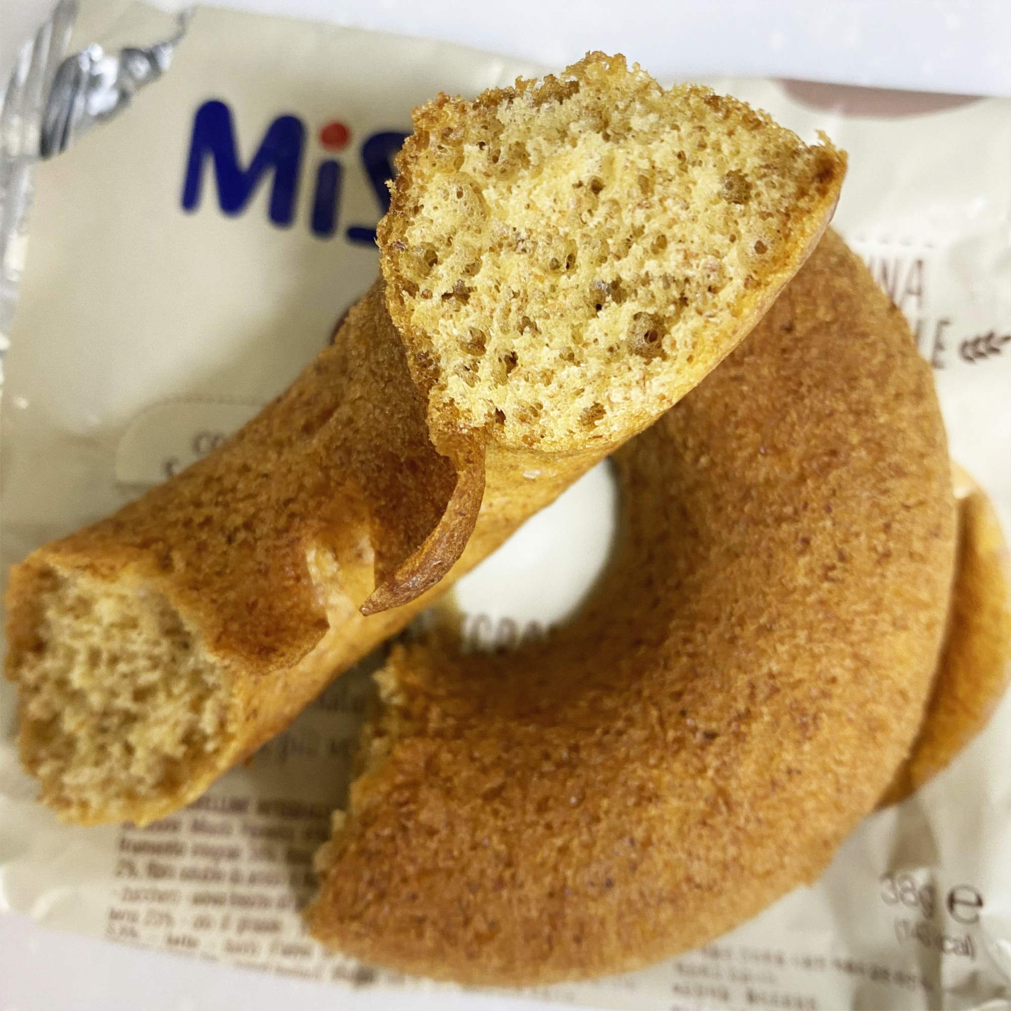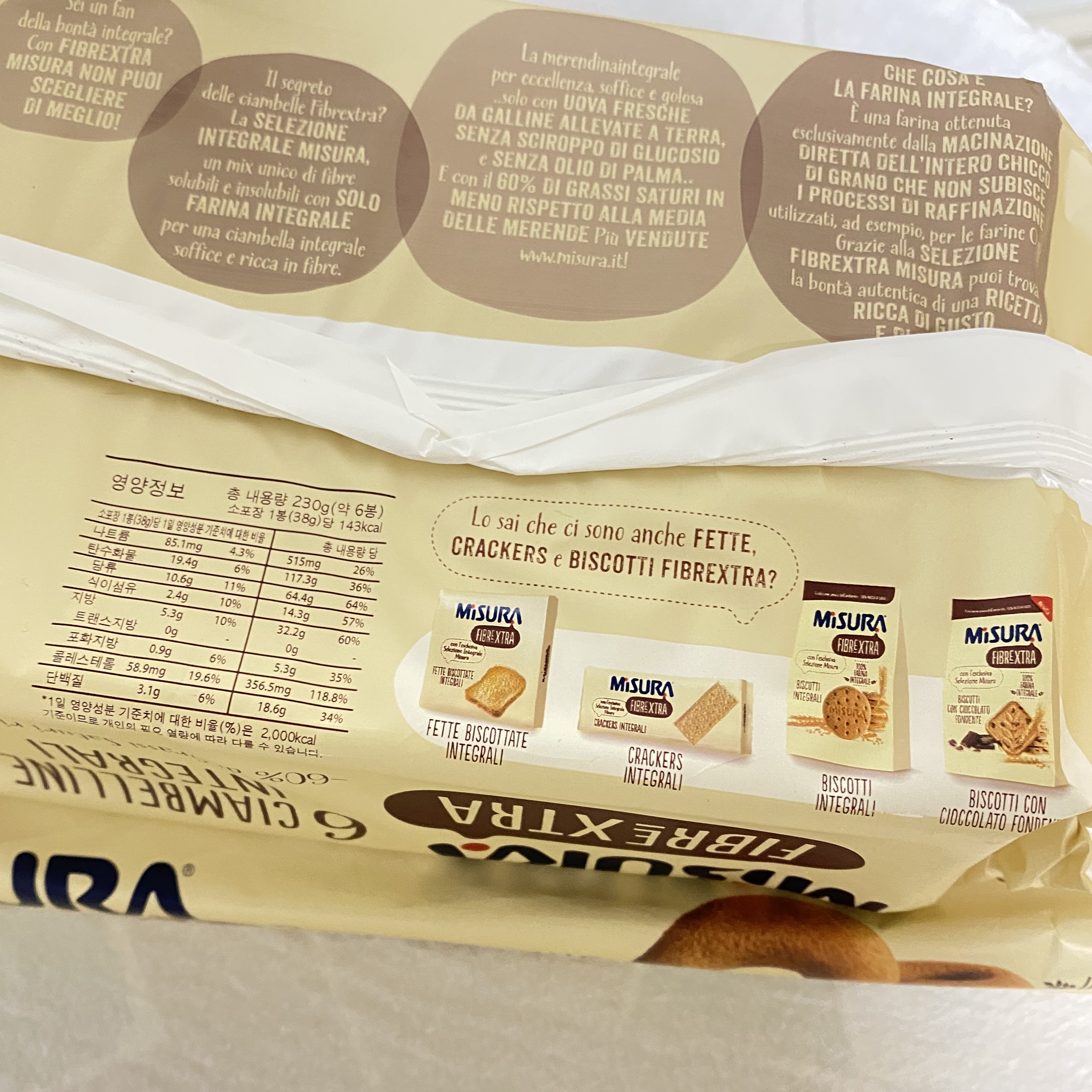 한 팩에 230g 6봉이 들어있습니다. 원산지는 이탈리아 입니다. 각각 낱개 포장 되어 있어 가방에 하나씩 넣고 다니기 좋은 미주라 통밀 도너츠 입니다.