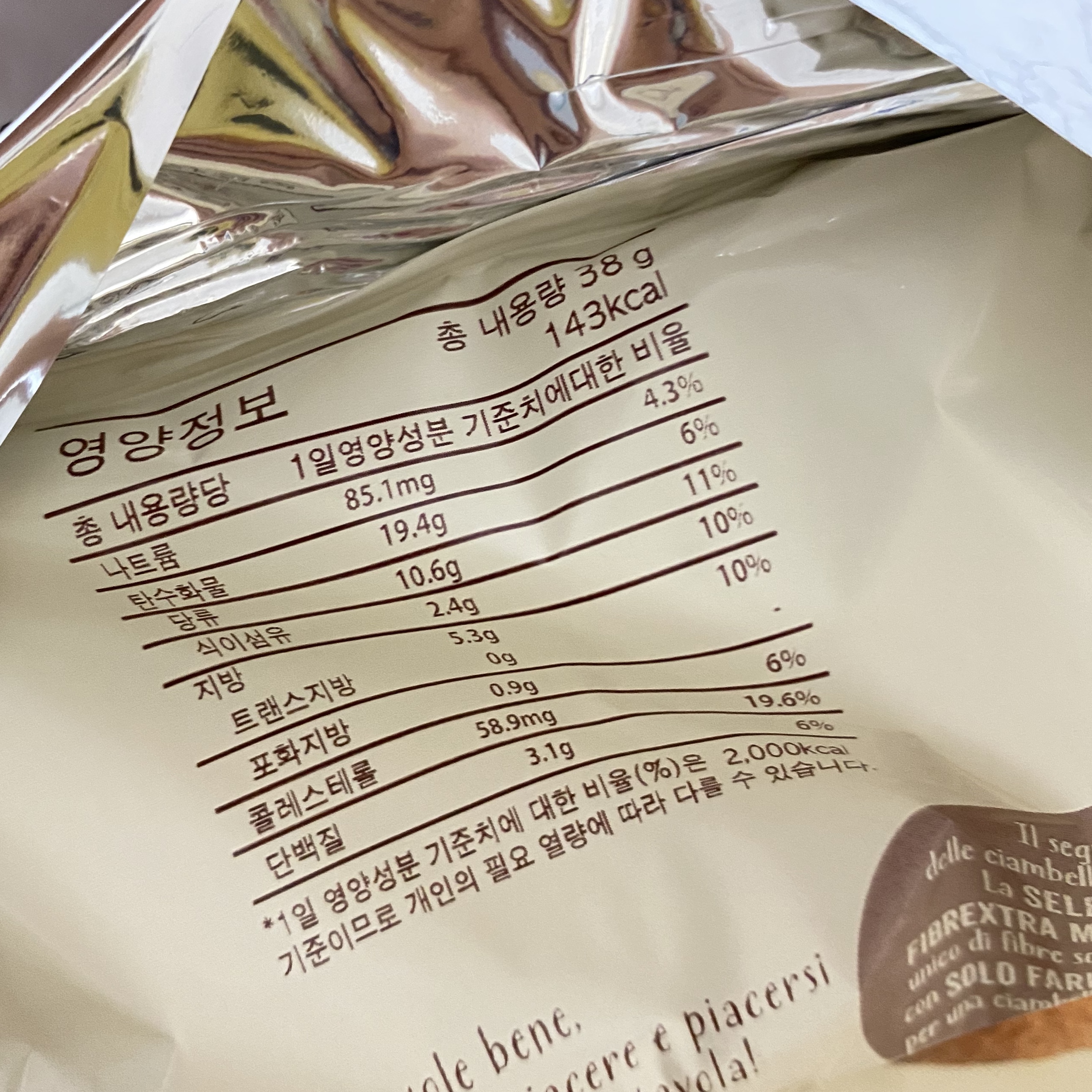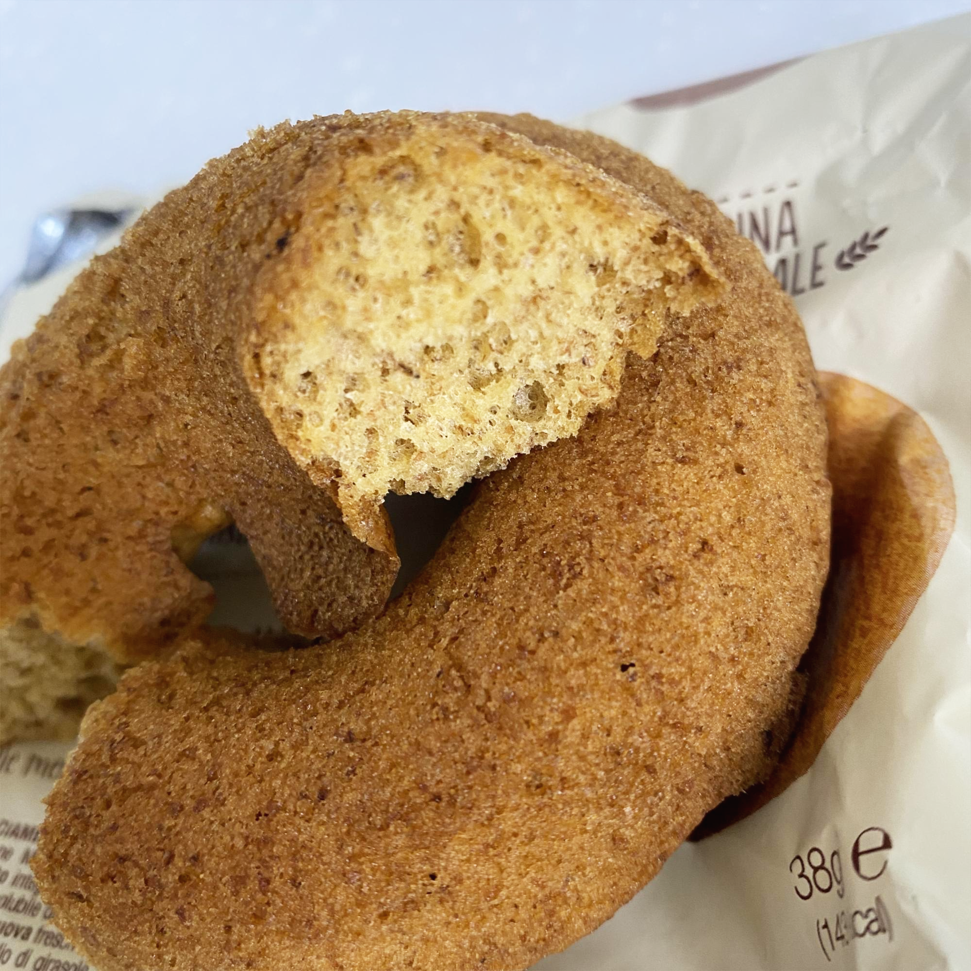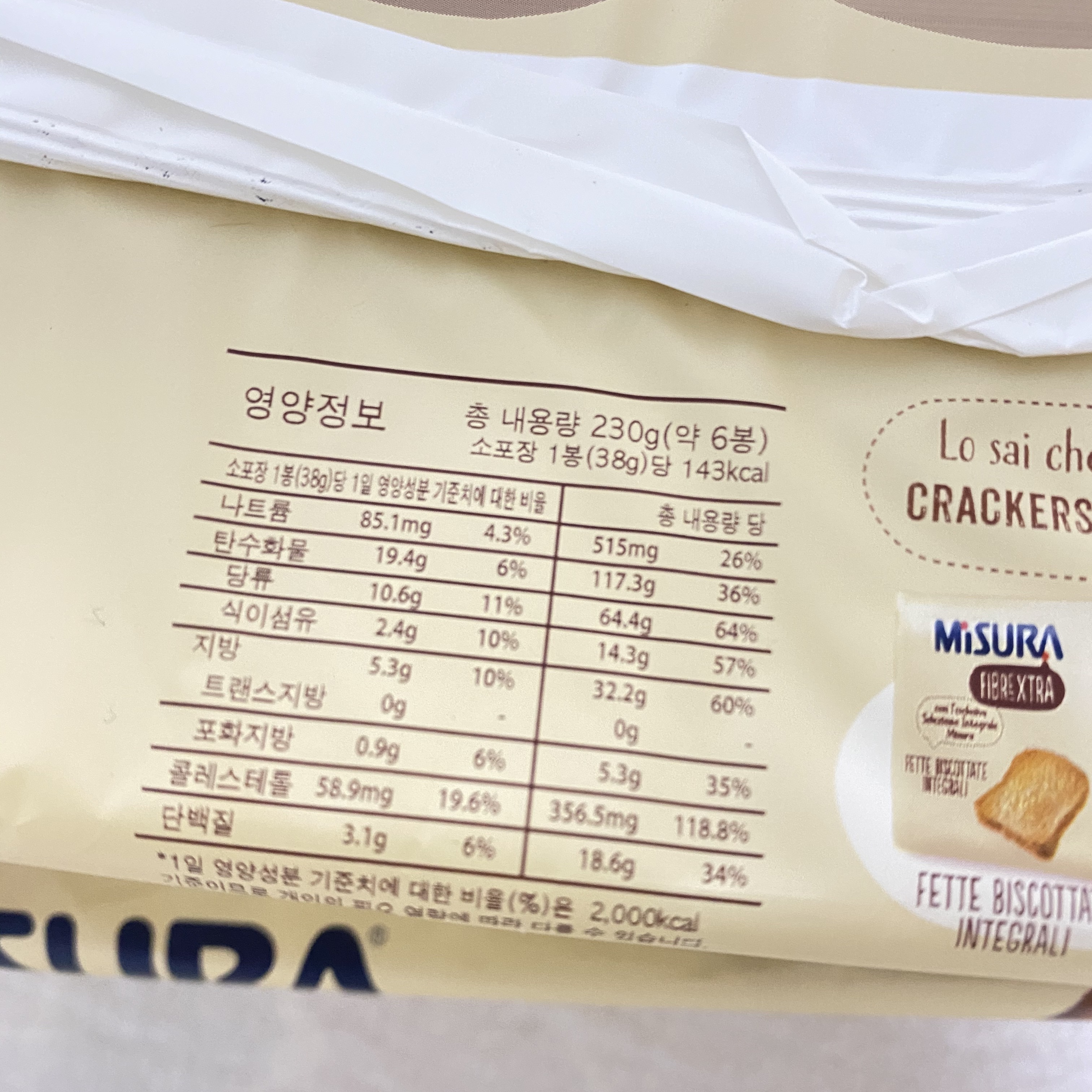 한 팩에 230g 6봉이 들어있습니다. 원산지는 이탈리아 입니다. 각각 낱개 포장 되어 있어 가방에 하나씩 넣고 다니기 좋은 미주라 통밀 도너츠 입니다.