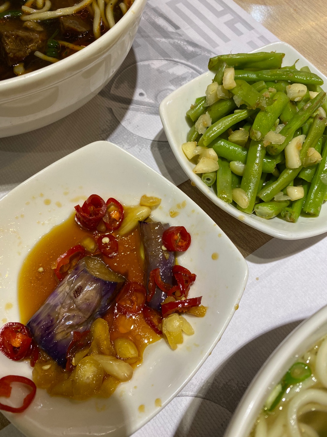 반찬에 있는 고추와 마늘이랑 같이 기름진 우육면을 먹으니 맛있었습니다.