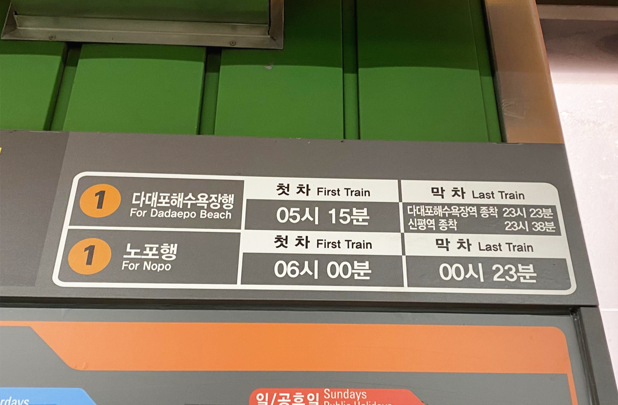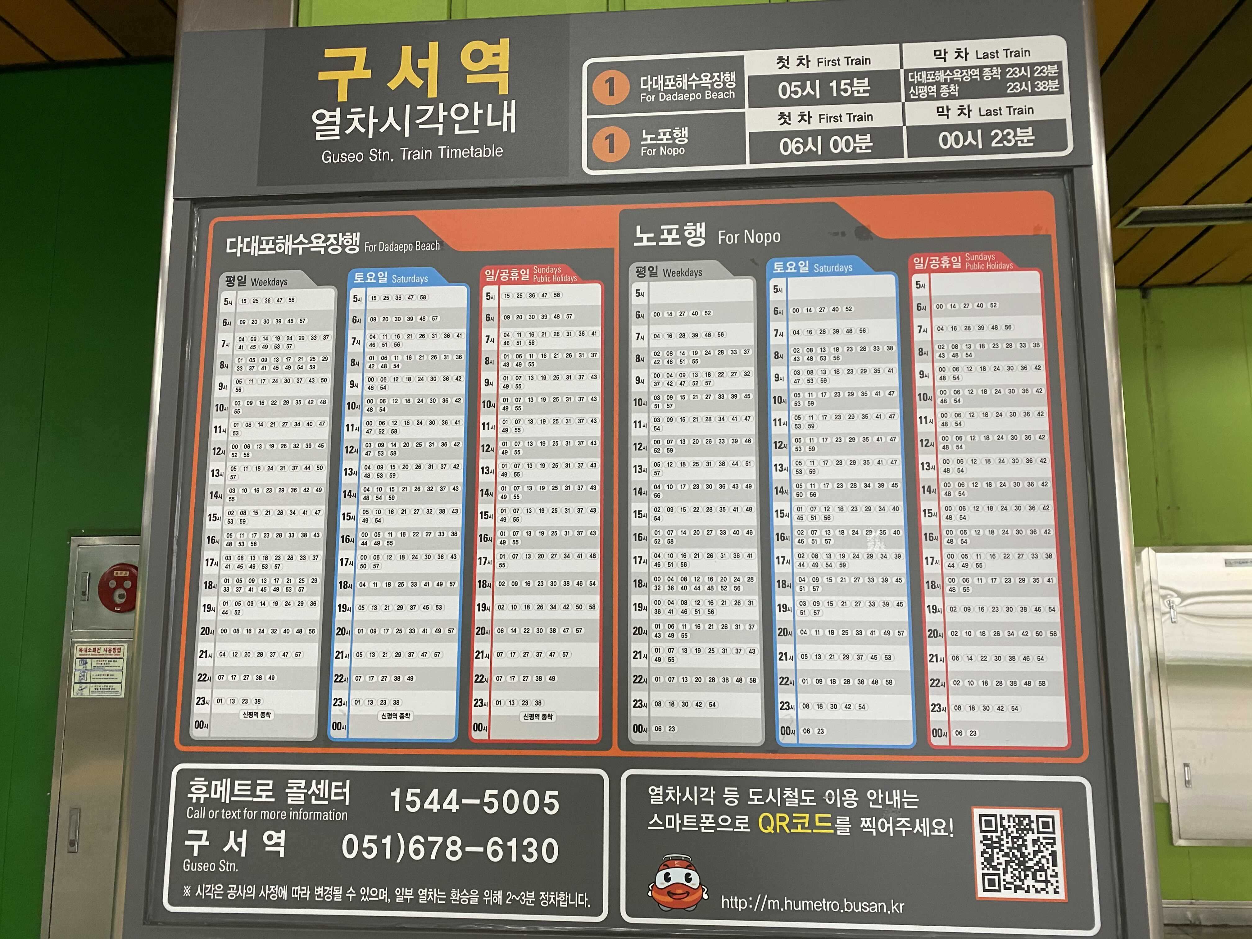 구서역 다대포해수욕장행과 노포행 열차시각 안내(Guseo station train timetable)입니다.