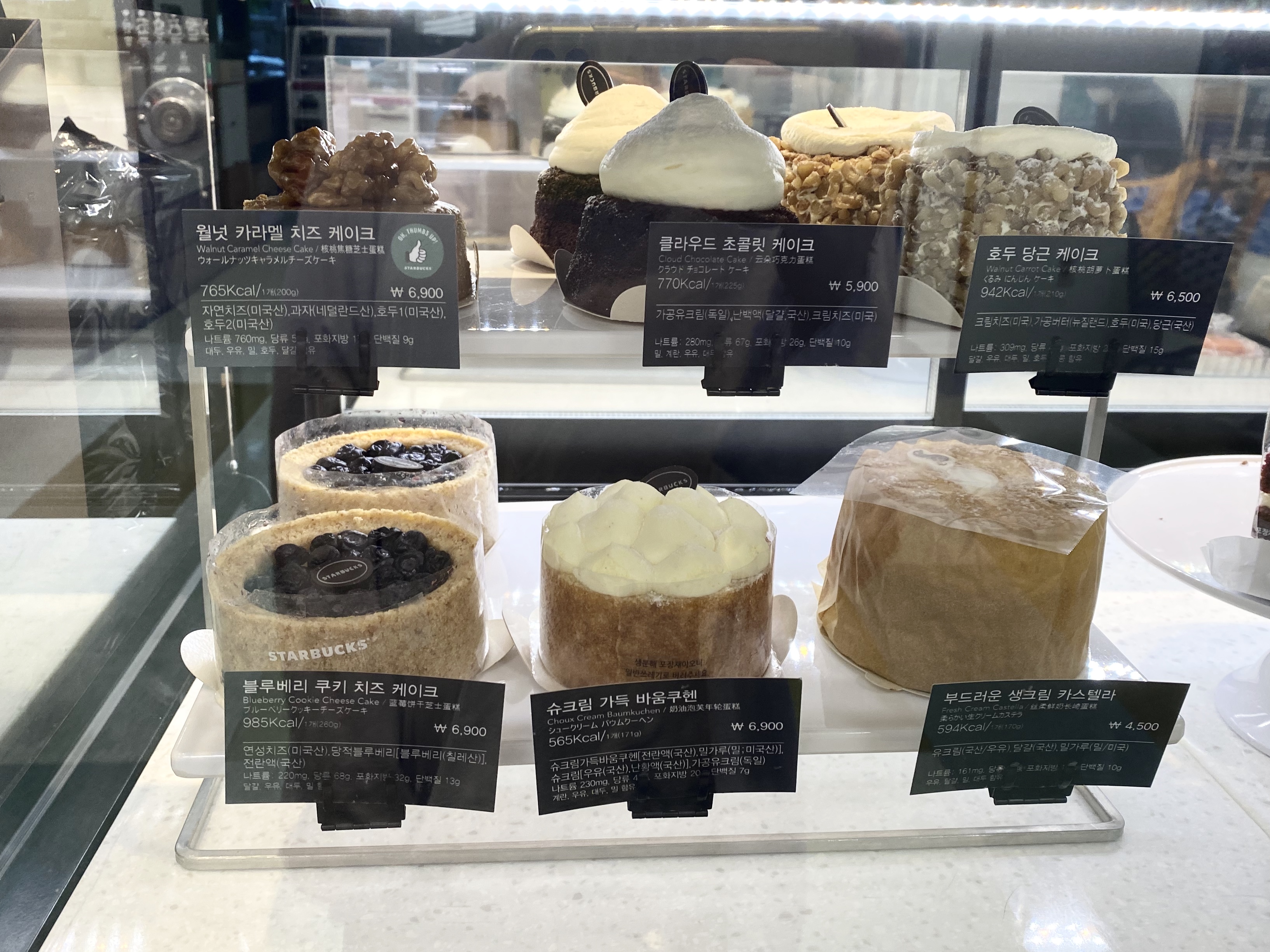 그 외에 클라우드 초콜릿 케이크 5,900원(770kcal) 호두 당근 케이크 6,500원(무려 942kcal ㄷㄷㄷ)스타벅스에 오면 강추하는 메뉴 중 하나인 블루베리 쿠키 치즈 케이크는 6,900원(985kcal 사악한 칼로리지만 레알 맛있습니다 ) 슈크림 가득 바움쿠헨 6,900원(565kcal) 부드러운 생크림 카스텔라 4,500원(594kcal) 입니다. 제가 스타벅스에서 좋아하는 진한 녹차 생크림 케이크 가 안보여서 서운했습니다. 진한 맛인지는 모르겠지만 은근 맛있고 칼로리도 272kcal밖에 안나가는데 사람들이 몰라줘서 섭섭합니다.