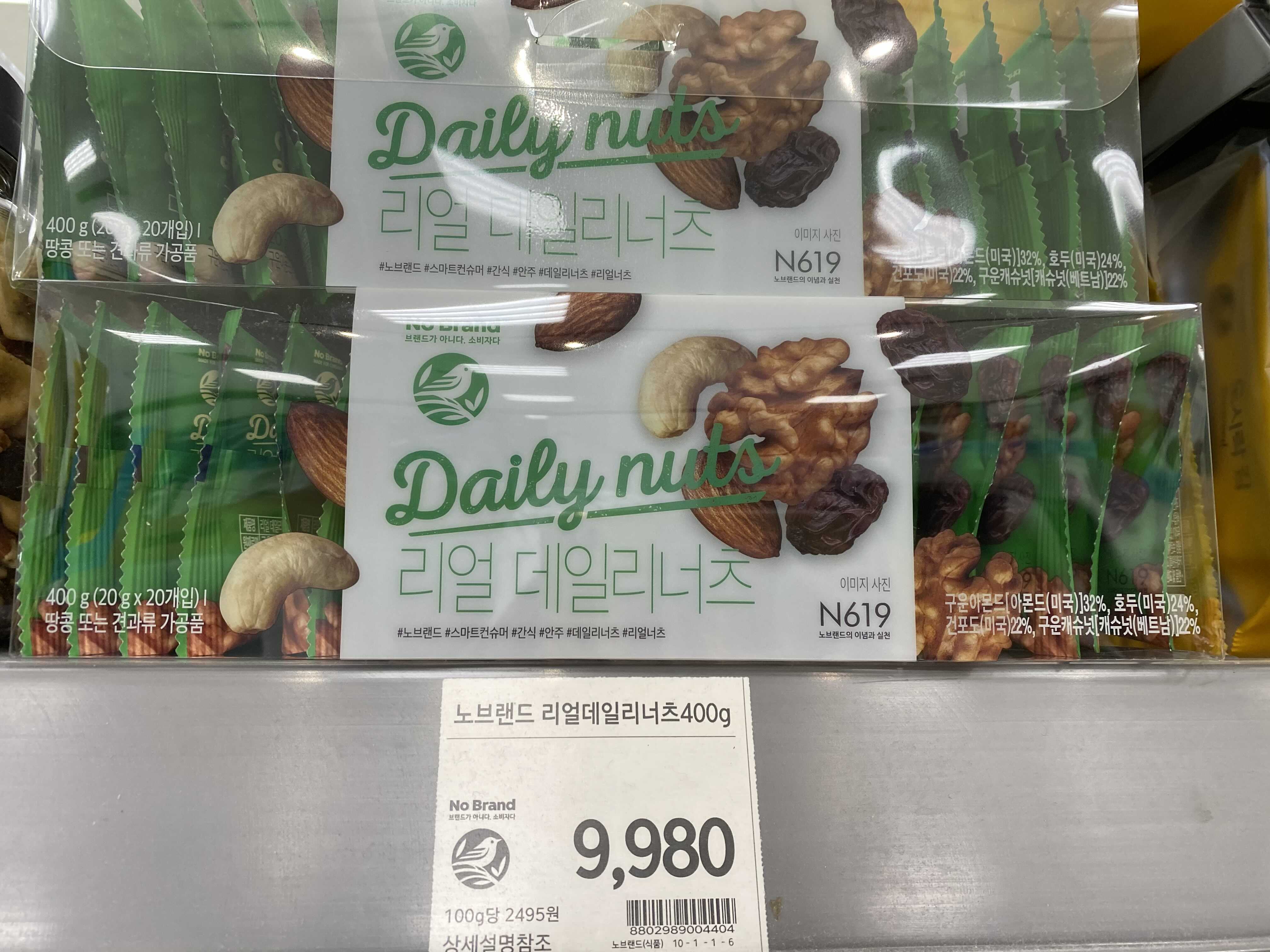 노브랜드 믹스넛(600g)과 노브랜드 리얼데일리너츠(400g)는 둘다 9,980원입니다. 견과류가 몸에도 좋고 두뇌에도 굉장히 좋다는거 다들 알고는 있습니다만.. 매일 먹어주는 것도 은근 힘듭니다. 리얼 데일리너츠 처럼 소포장 되어 있으면 심심할때 까먹기도 딱 좋을 것 같습니다.