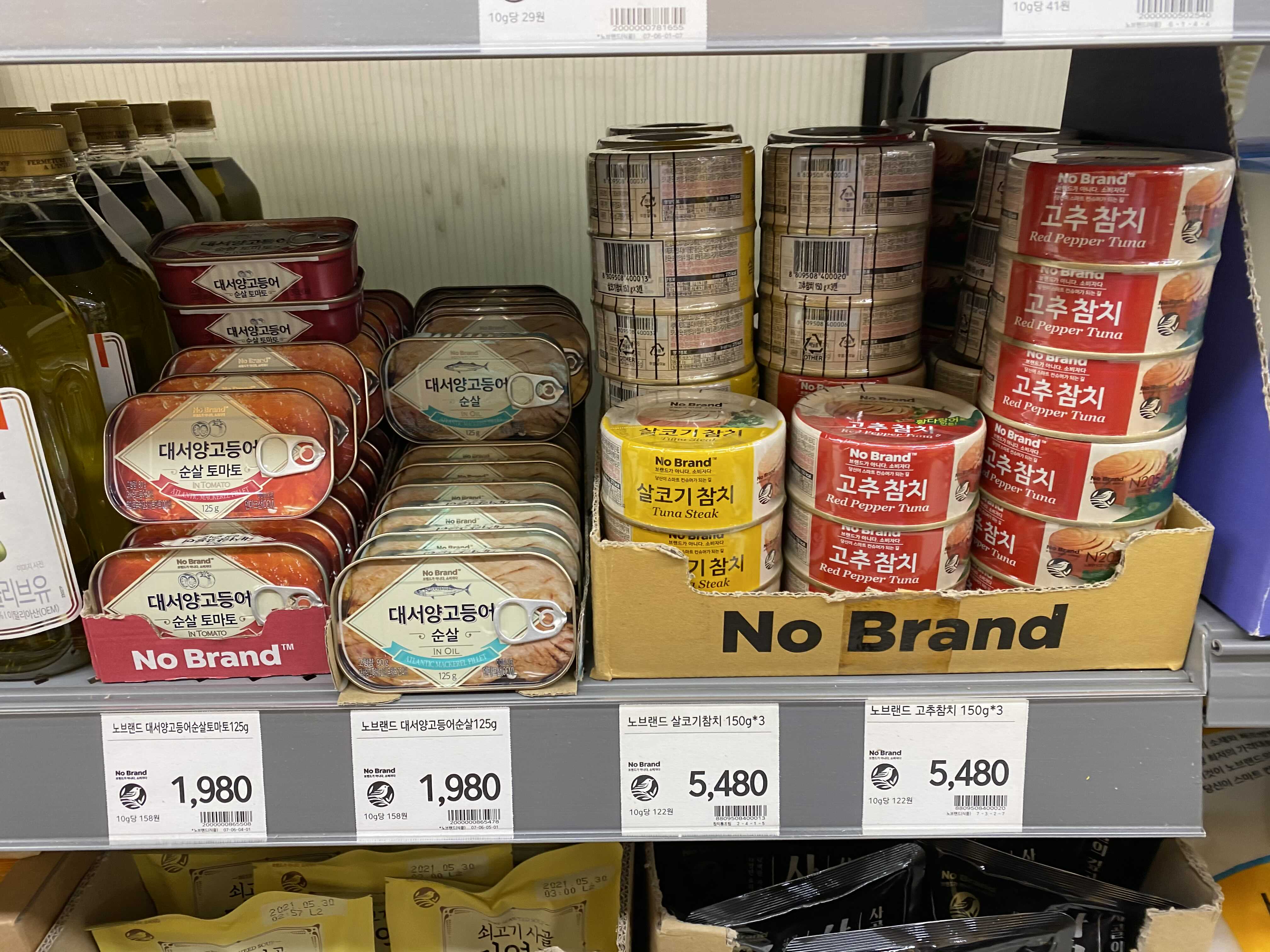 각종 통조림 제품이 보입니다. 노브랜드 대서양 고등어 순살 토마토(125g) 과 대서양 고등어 순살(125g)은 1,980원입니다. 순살 토마토 라니 듣도 보지도 못한 통조림입니다 ㅋㅋ 노브랜드 살코기참치 150g*3 과 고추참치150g*3 은 5,480원으로 일반 브랜드 제품을 사는 것보다 훨씬 저렴한 가격입니다.