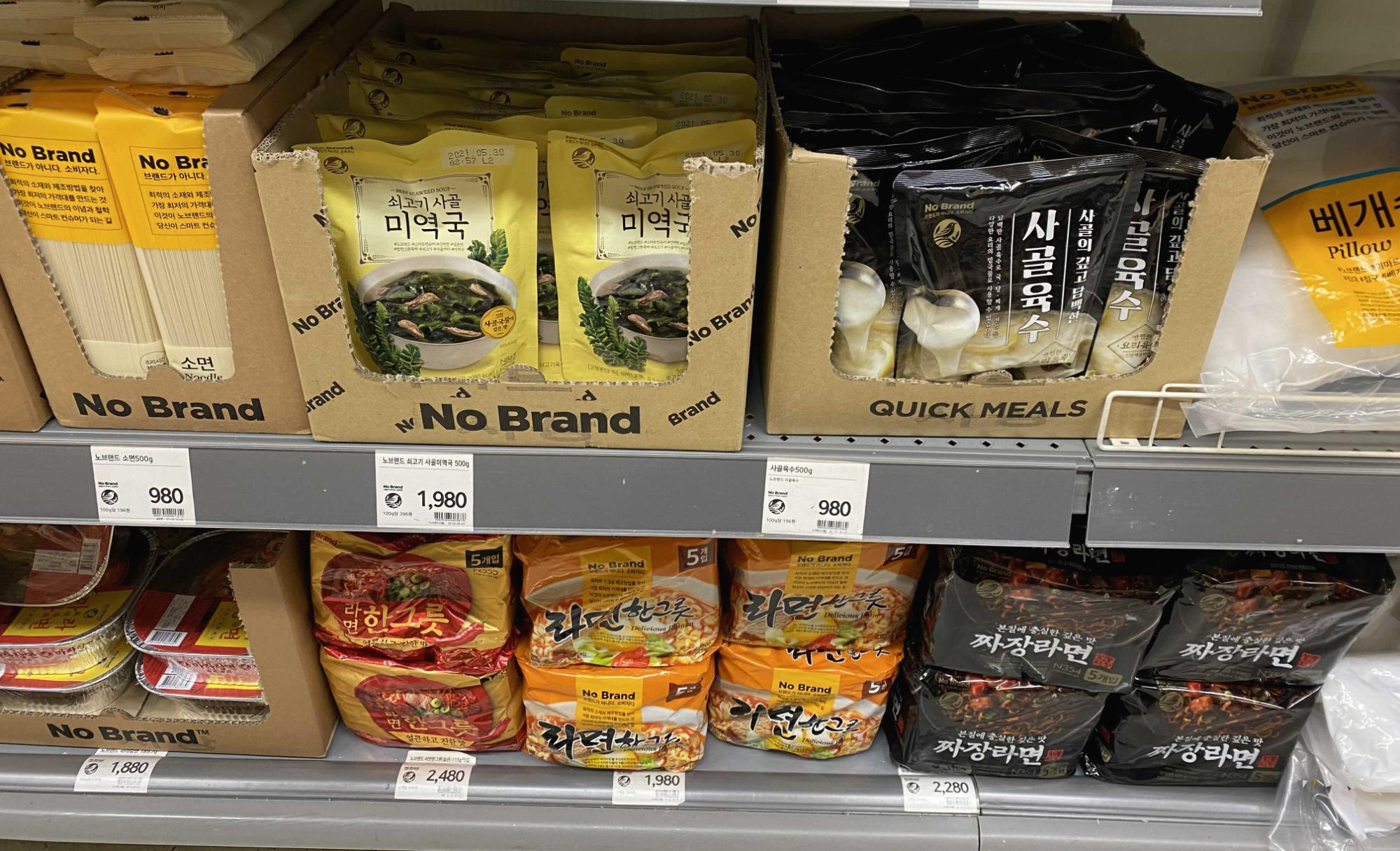 노브랜드 소면(500g) 980원 쇠고기 사골미역국(500g) 1980원 사골육수(500g) 980원 노브랜드마라탕면 1,880원 노브랜드라면한그릇(5개)매운맛 2,480원, 그냥 라면한그릇은 1980원입니다. 라면은 매운맛이 더 비싼데 이유는 모르겠습니다 ㅋㅋ 라면 5개입에 2천원도 안하다니 정말 저렴합니다. 짜장라면은 2,280원입니다.