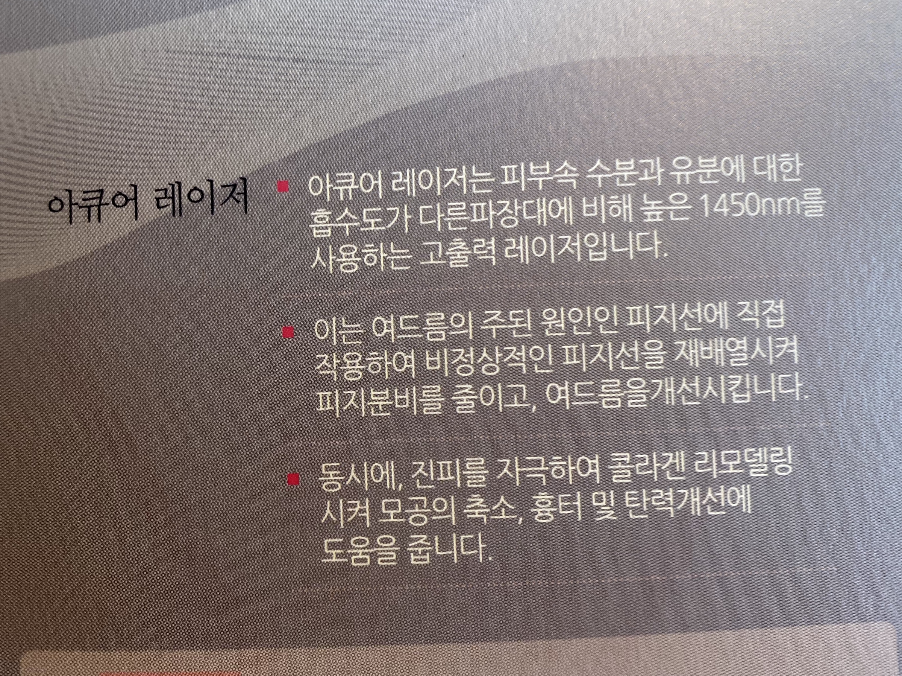 아큐어 레이저는 피부 속 수분과 유분에 대한 흡수도가 다른파장대에 비해 높은 1450nm를 사용하는 고출력 레이저입니다. 이는 여드름의 주된 원인인 피지선에 직접 작용하여 비정상적인 피지선을 재배열시켜 피지분비를 줄이고 여드름을 개선시킵니다. 동시에 진피를 자극하여 콜라겐 리모델링을 시켜 모공 축소 흉터 및 탄력 개선에 도움을 줍니다.