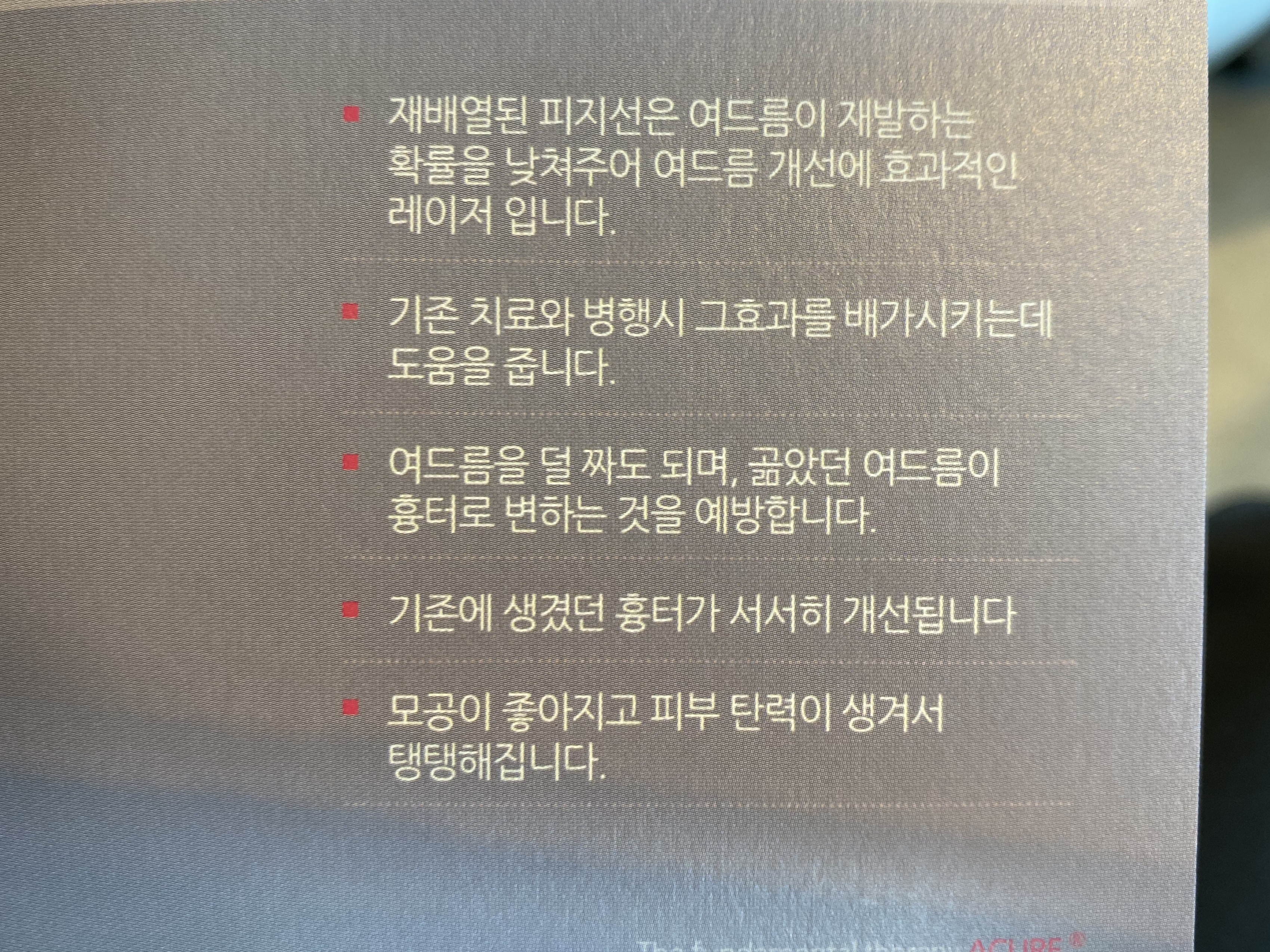 굿바이~!여드름~! 여드름 뿐만 아니라 모공 탄력까지 개선시켜 주는 레이저가 있습니다. 요즘 레이저 종류가 워낙 다양하고 피부과에서 사용하는 레이저도 천차만별인 것 같습니다. 그 수많은 레이저 이름은 들어도 들어도 까먹는데요, 그 중 하나가 아큐어레이저입니다. ㅋㅋ