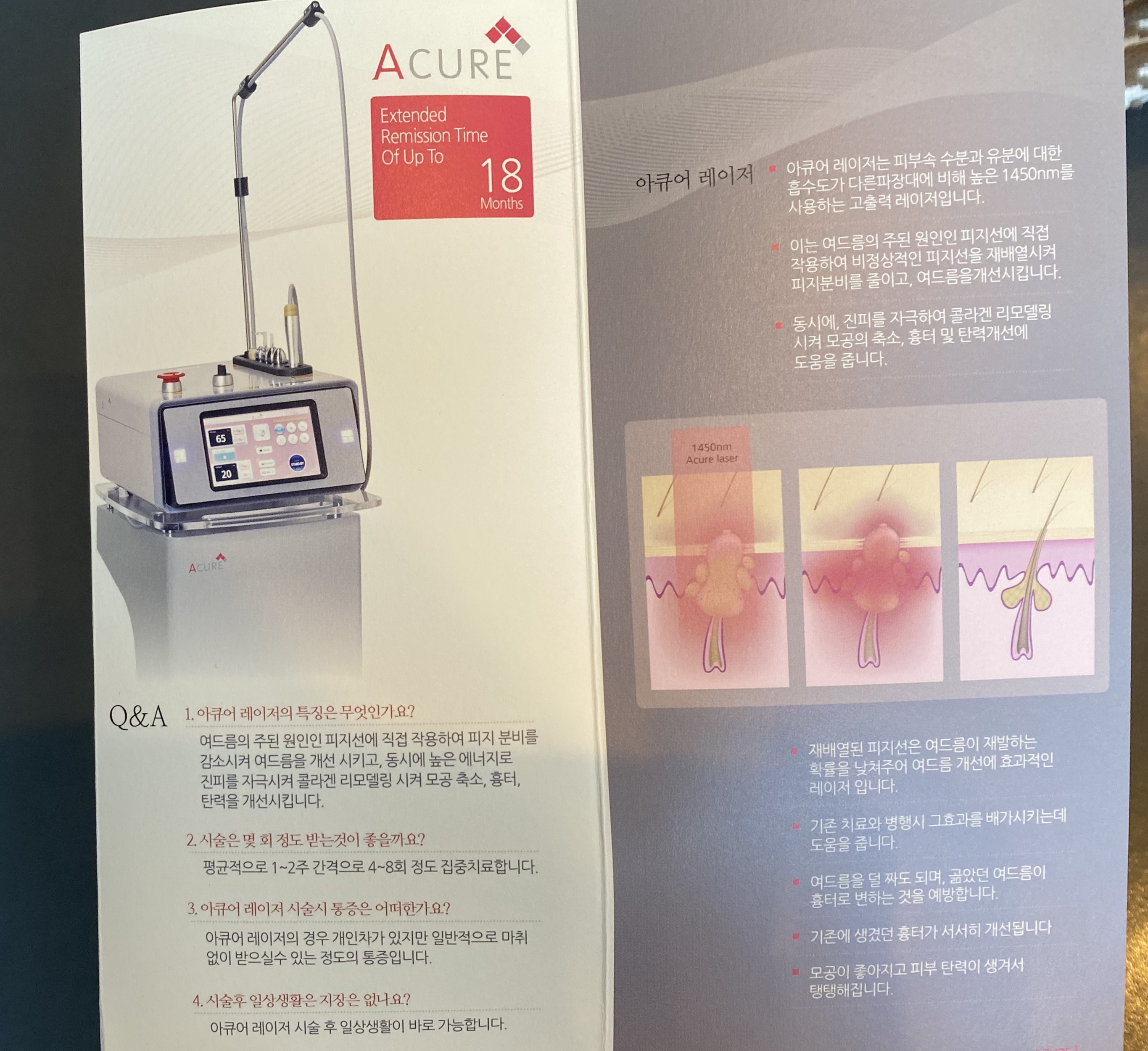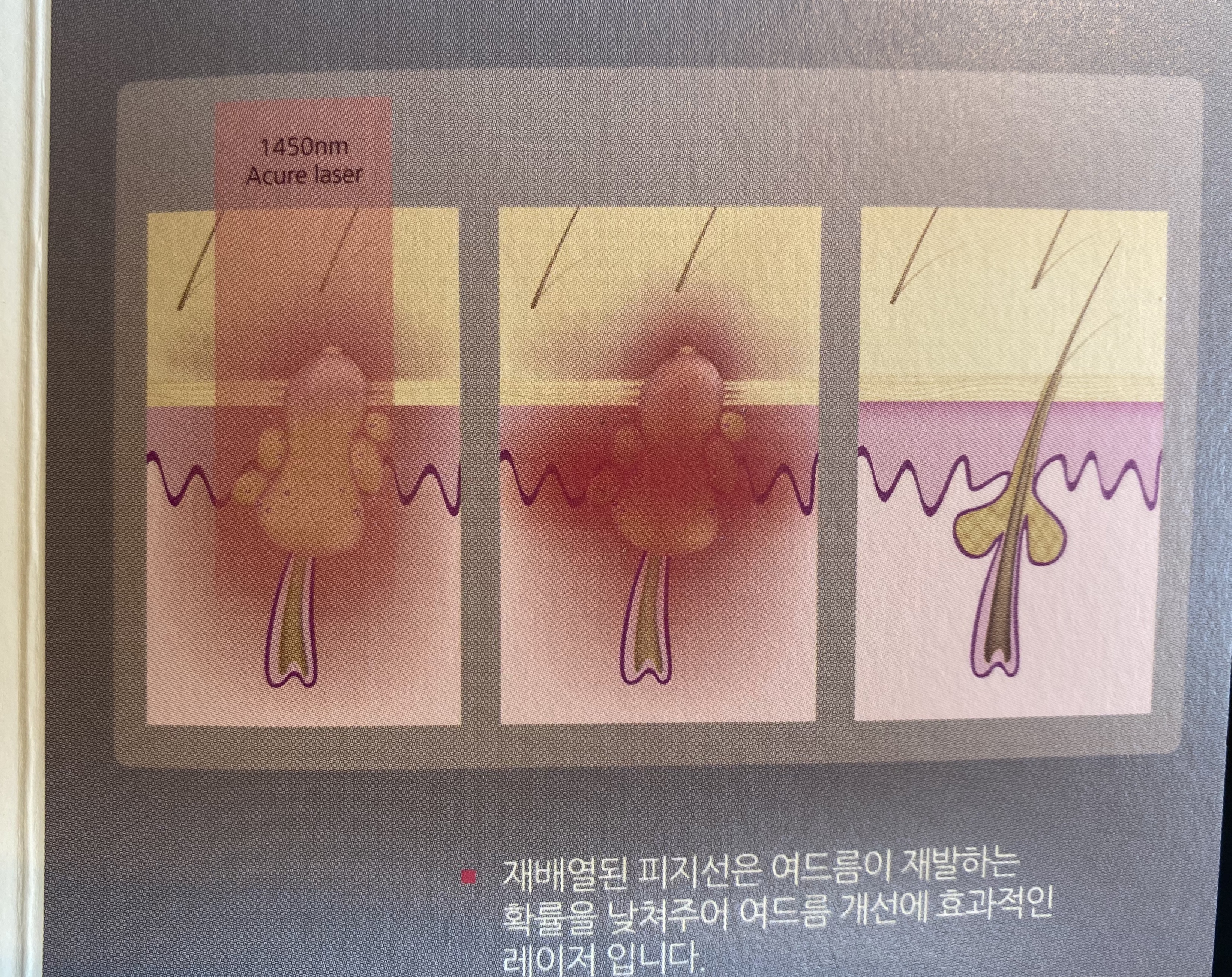 아큐어 레이저는 피부 속 수분과 유분에 대한 흡수도가 다른파장대에 비해 높은 1450nm를 사용하는 고출력 레이저입니다. 이는 여드름의 주된 원인인 피지선에 직접 작용하여 비정상적인 피지선을 재배열시켜 피지분비를 줄이고 여드름을 개선시킵니다. 동시에 진피를 자극하여 콜라겐 리모델링을 시켜 모공 축소 흉터 및 탄력 개선에 도움을 줍니다.