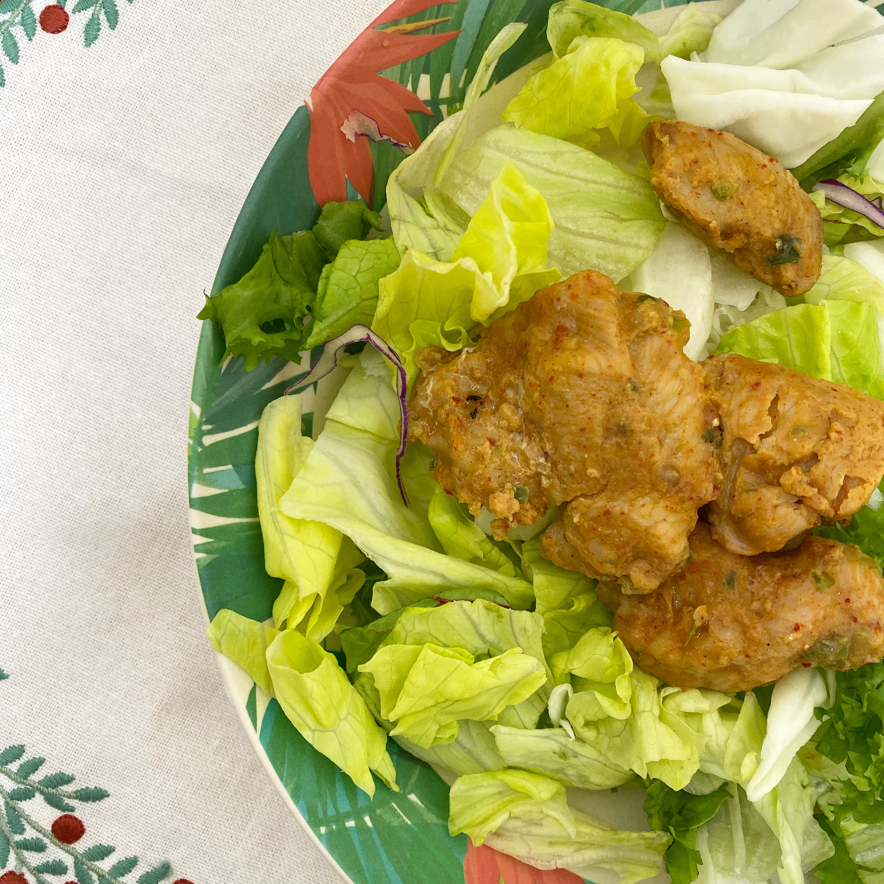 닭가슴살에 샐러드인데 전 샐러드드레싱 안하고 먹습니다. 밍밍하다기 보다 풀 자체의 맛이 좋습니다.