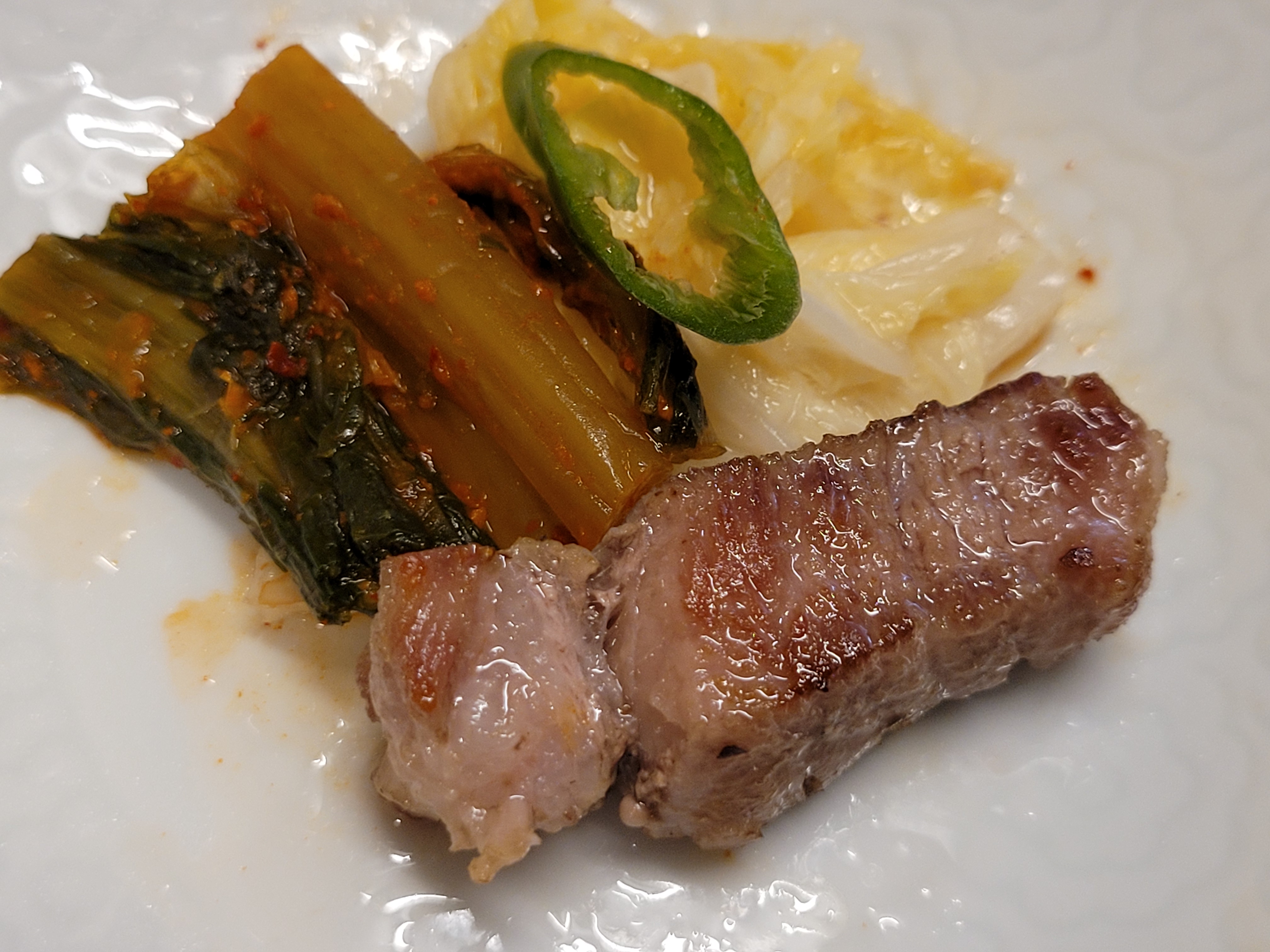 바싹 익힌 돼지목살을 여러가지 밑반찬들과 곁들여 먹었습니다.