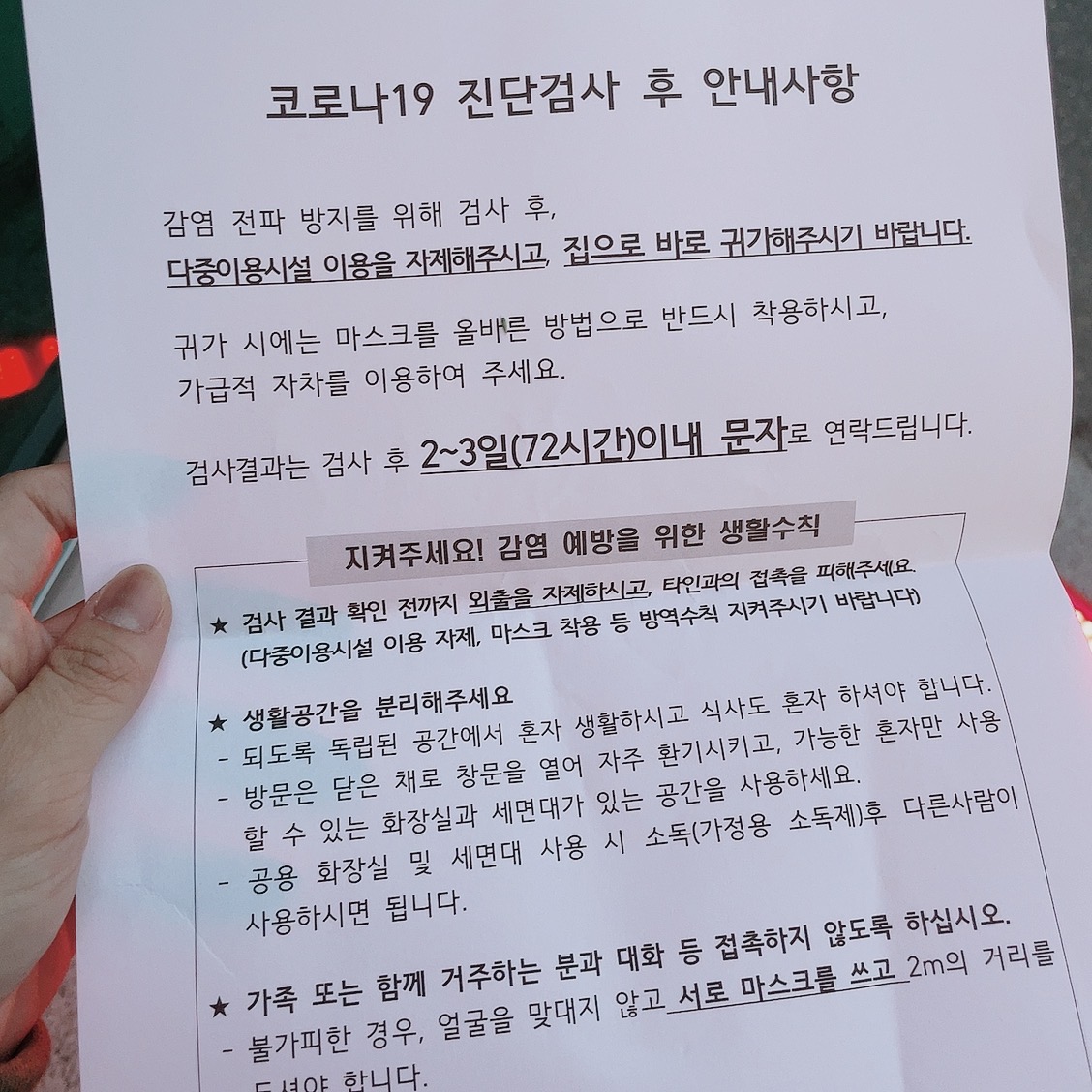 직원분이 이름확인을 하고 코로나19 진단검사 후 안내사항 종이와 키트를 주셨습니다.