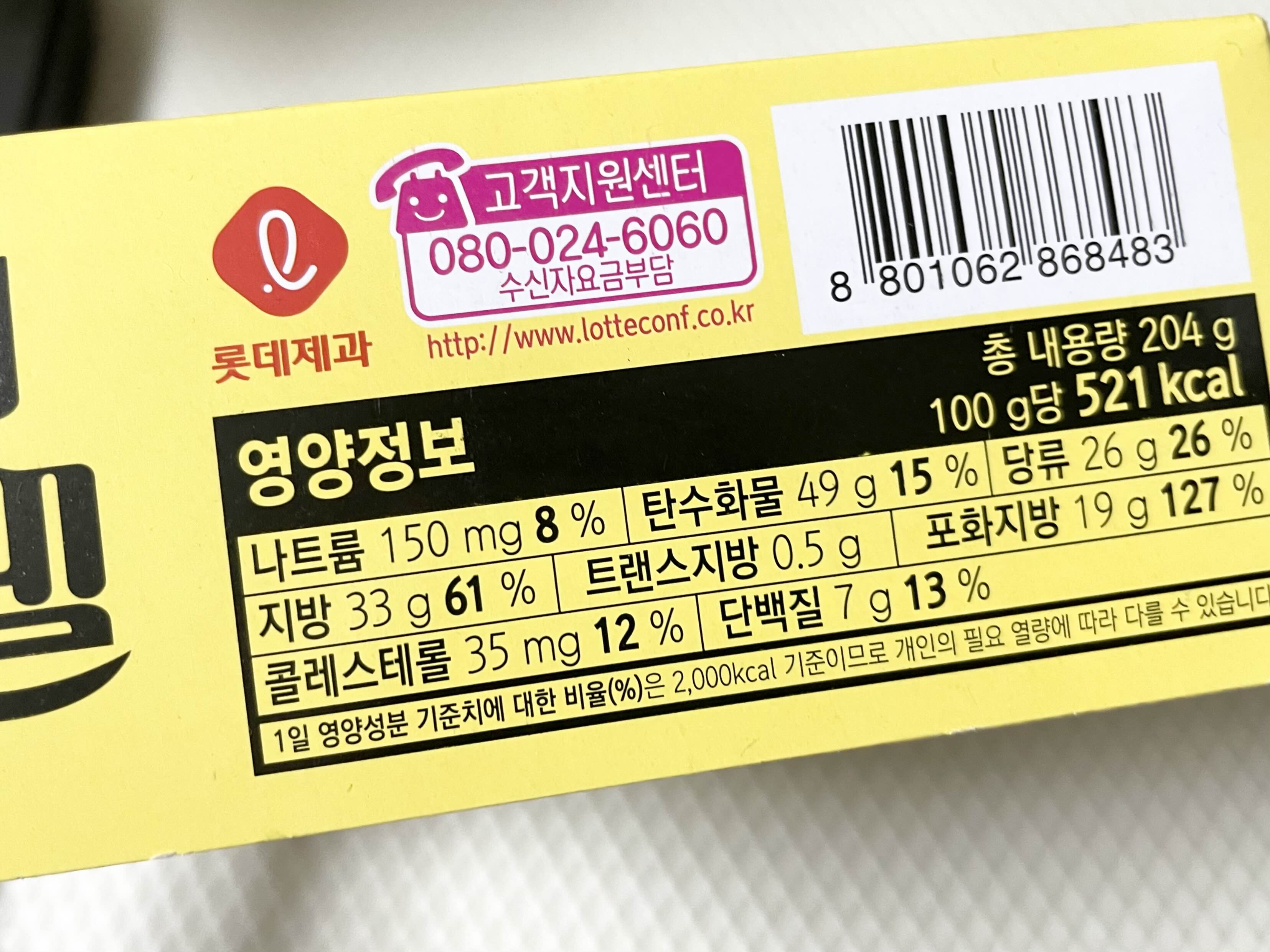 몽쉘 노티드 (Knotted x 쁘띠몽쉘) 한 박스에 총 204g 100g당 521kcal 입니다.