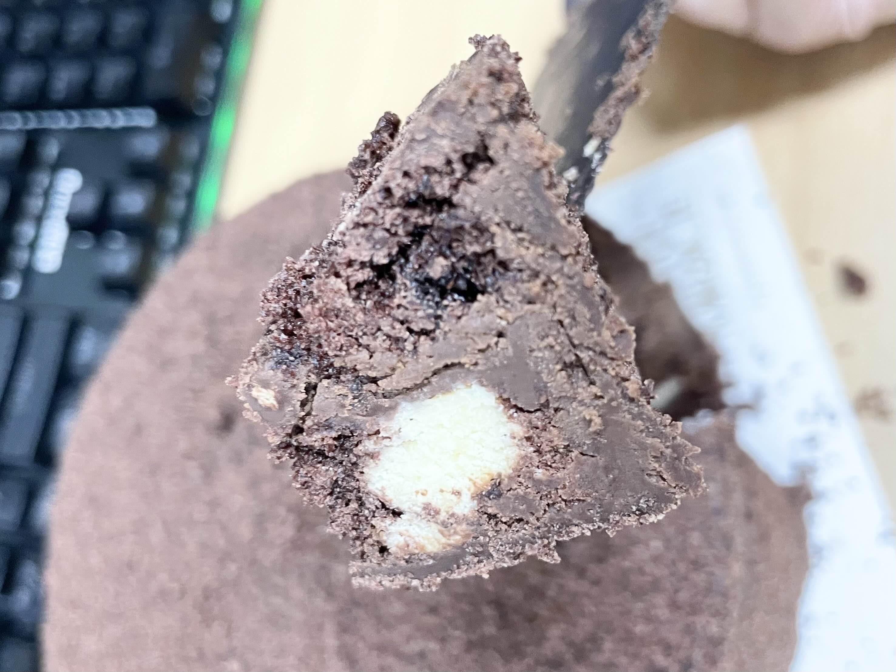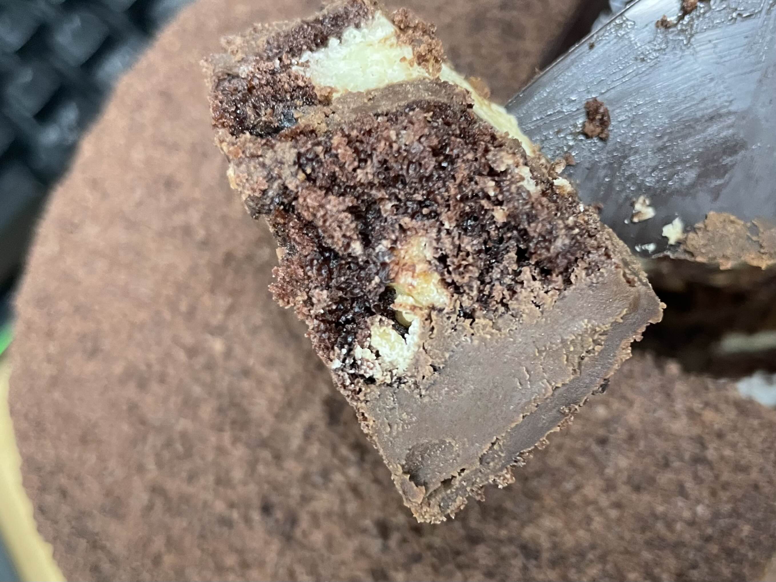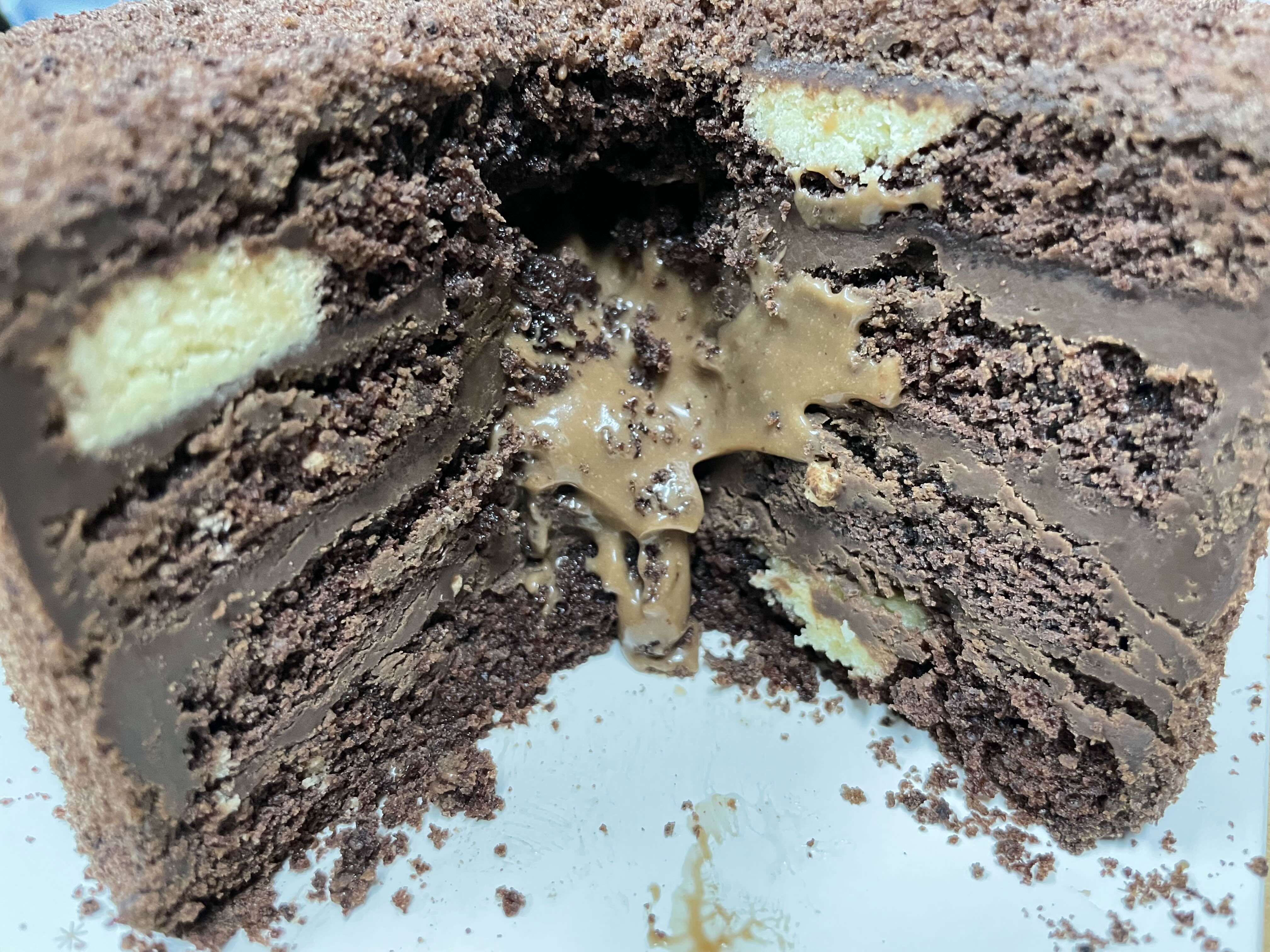 그리고 컷팅을 하니 녹은 밀크 초콜릿이 쏟아지더라구요!