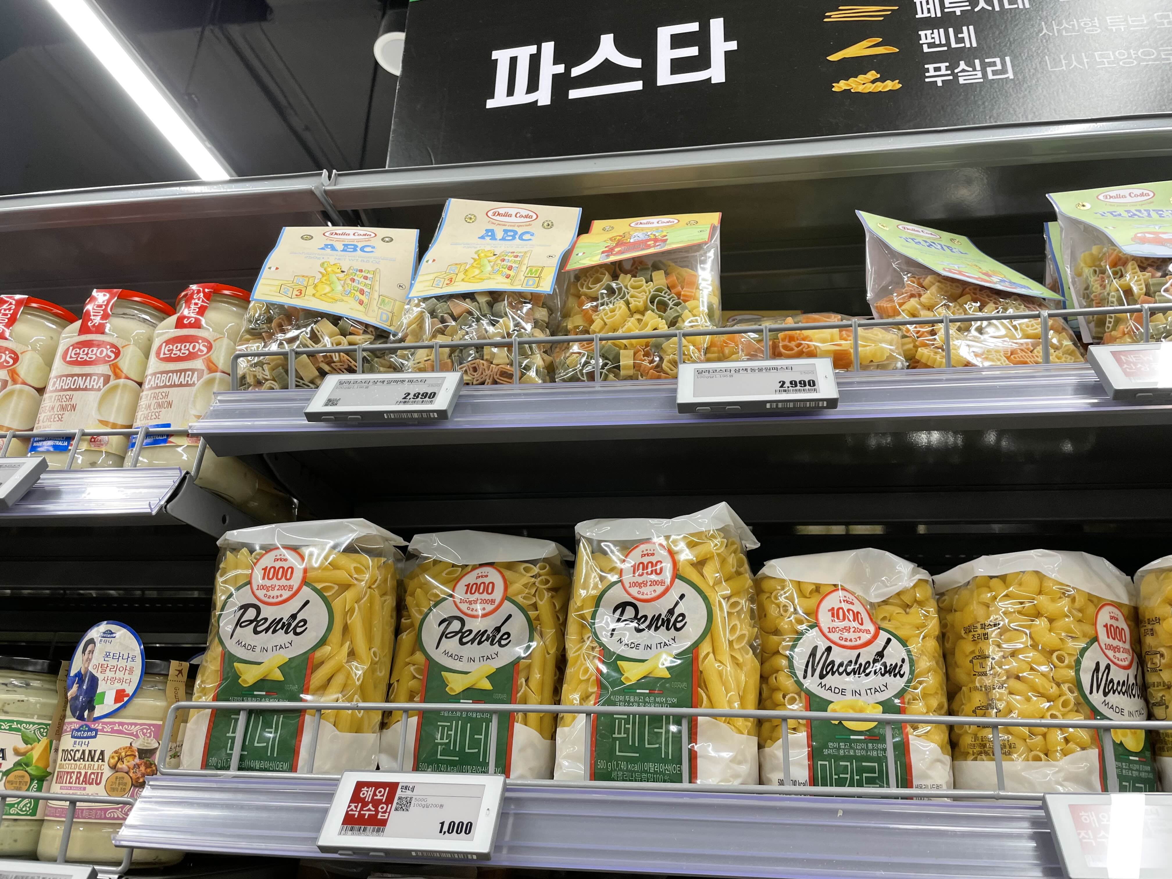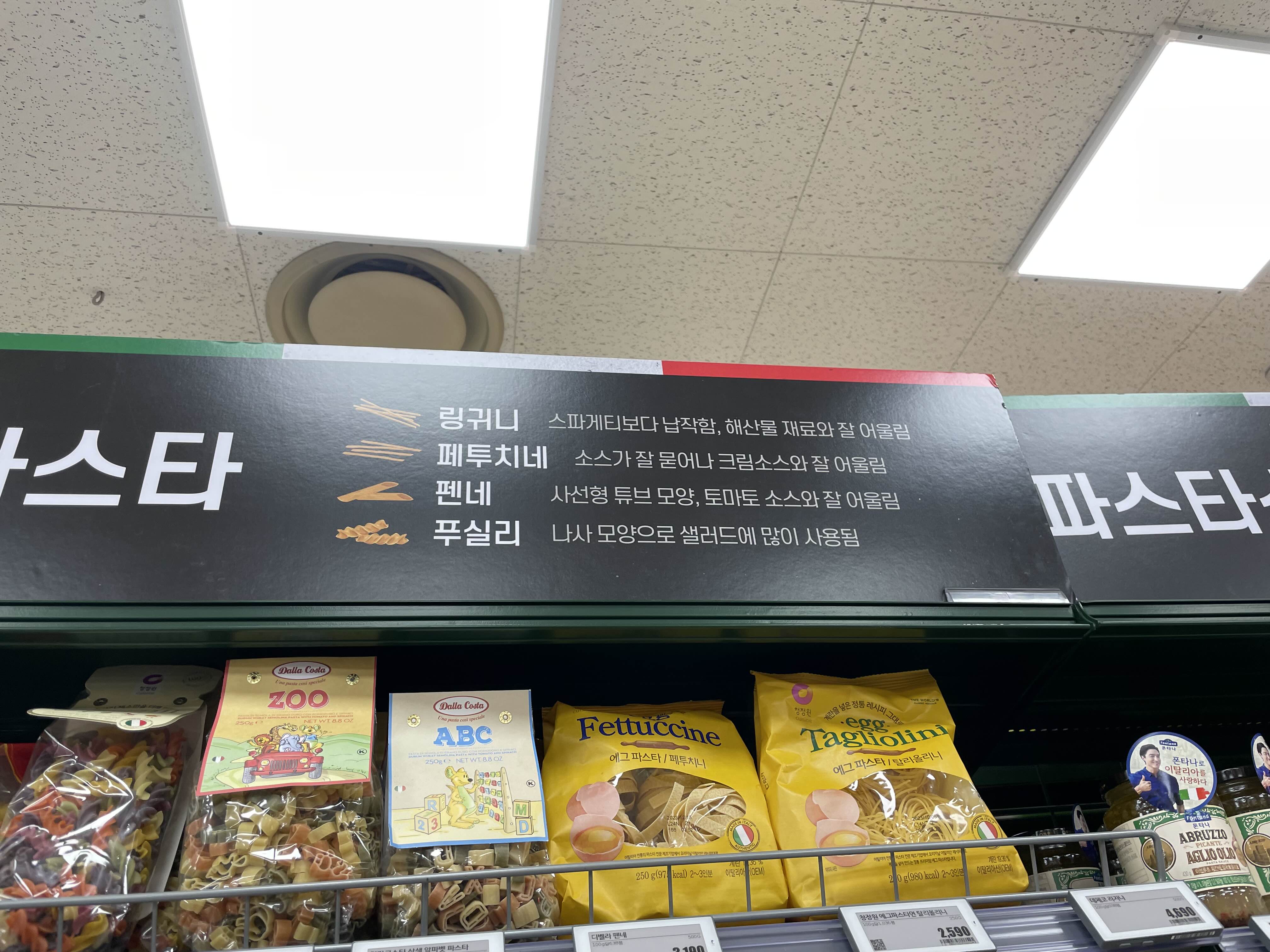 지하로 내려가 저의 목표인 파스타 종류가 있는 코너로 이동했습니다.