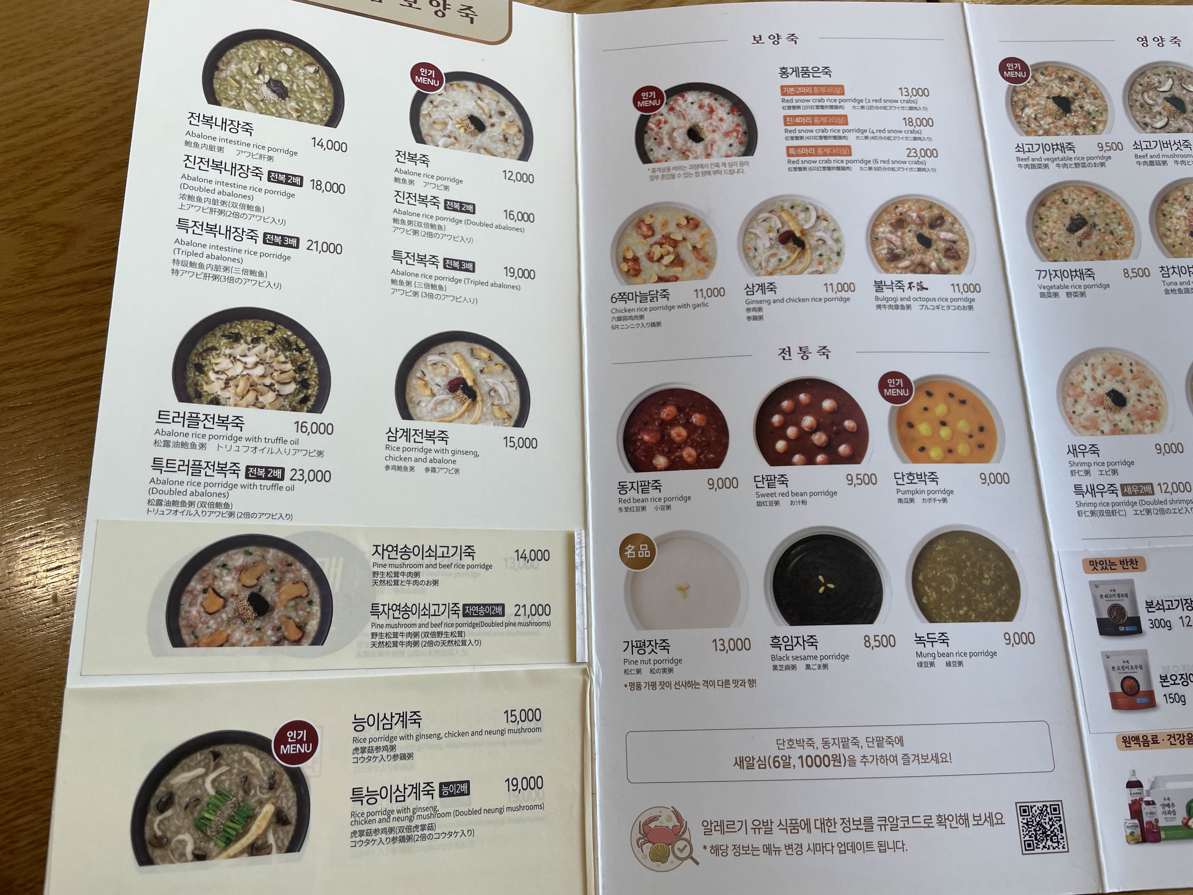 참치야채죽 9500원 해물죽 10,000원