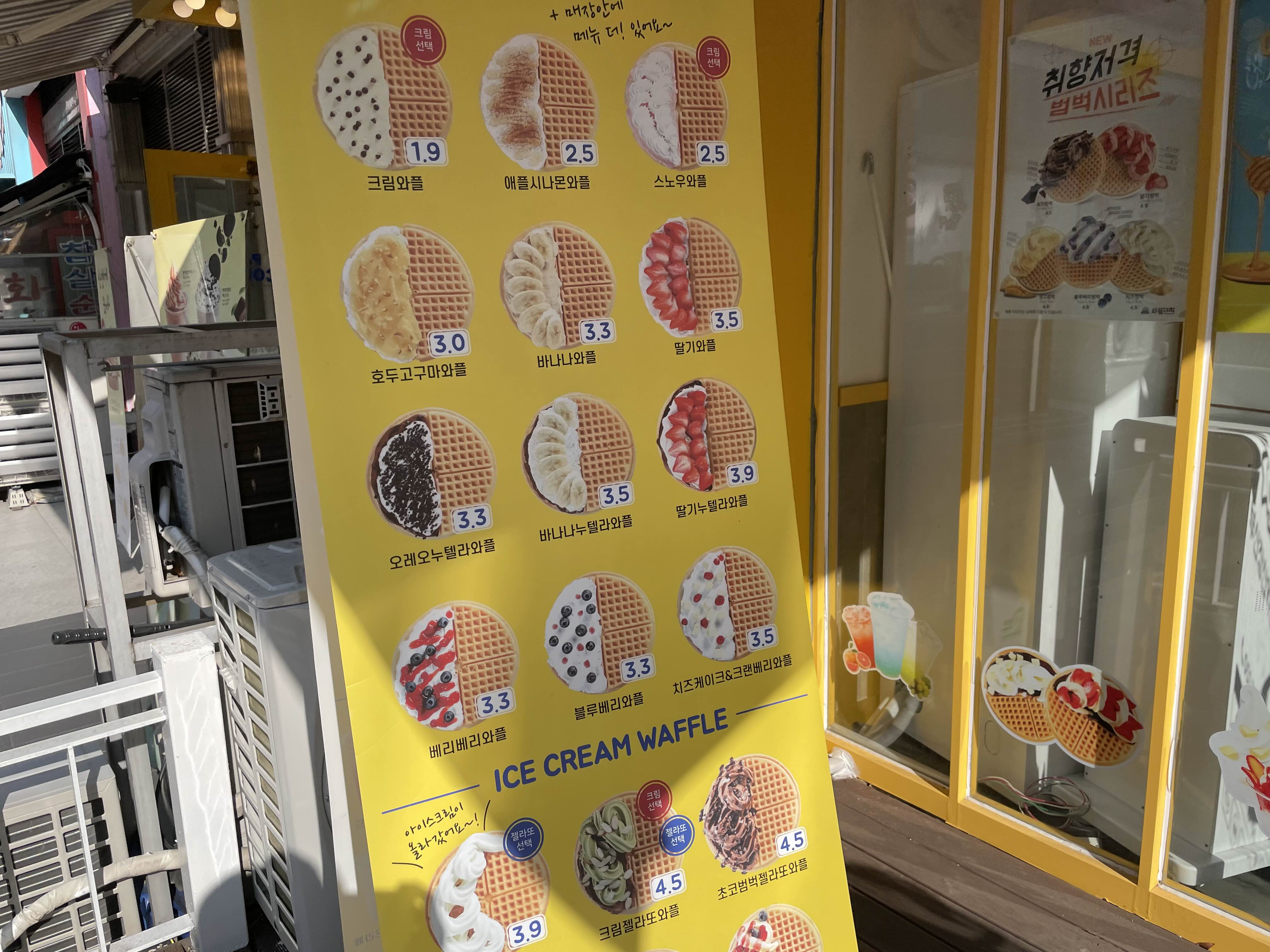 바깥 입간판에 와플대학 메뉴를 한눈에 알아볼 수 있도록 잘 해놓으셨더라구요