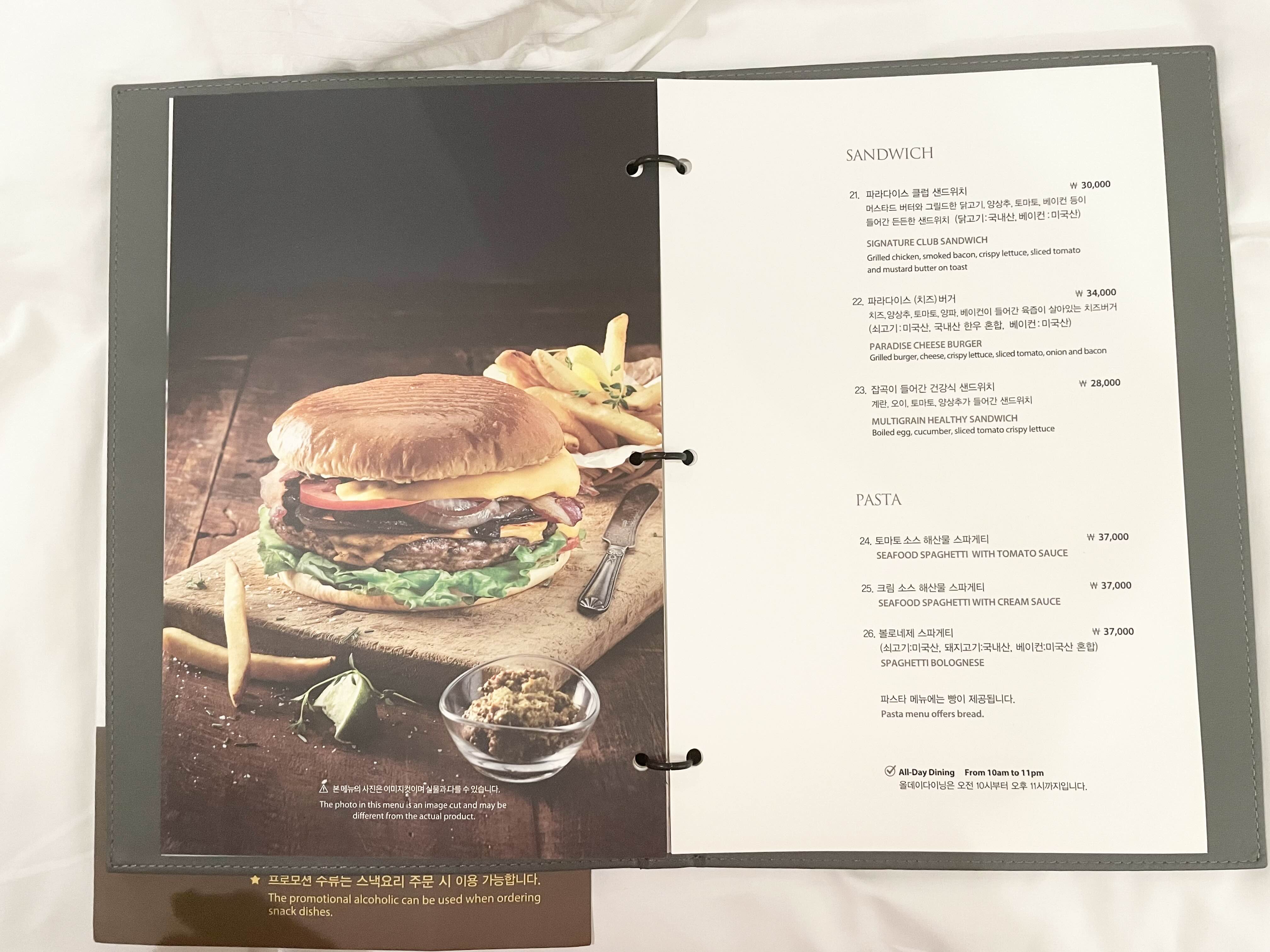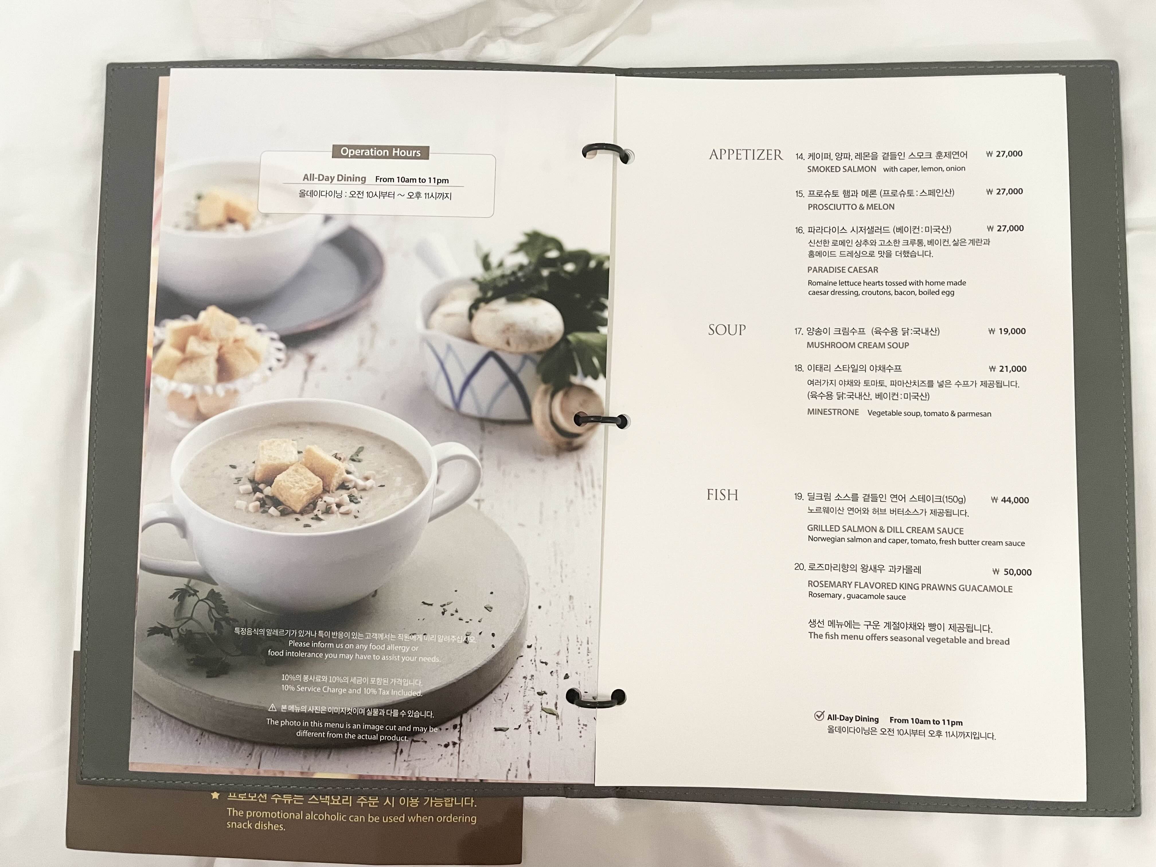 파라다이스 호텔 부산 룸서비스 올데이다이닝 시간과 메뉴입니다.