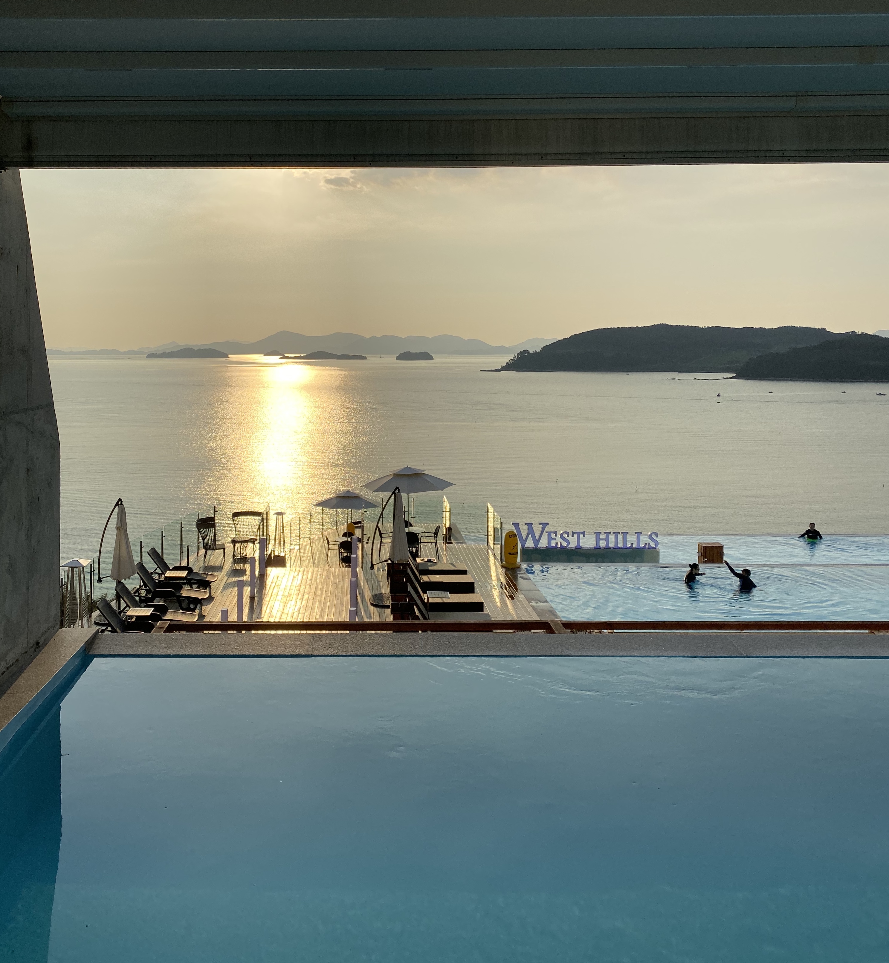 웨스트힐스(WEST HILLS)는 사계절내내 온수수영이 가능한 오션뷰수영장입니다 수영장 너머로 보이는 노을빛 여수바다가 너무너무 멋집니다.