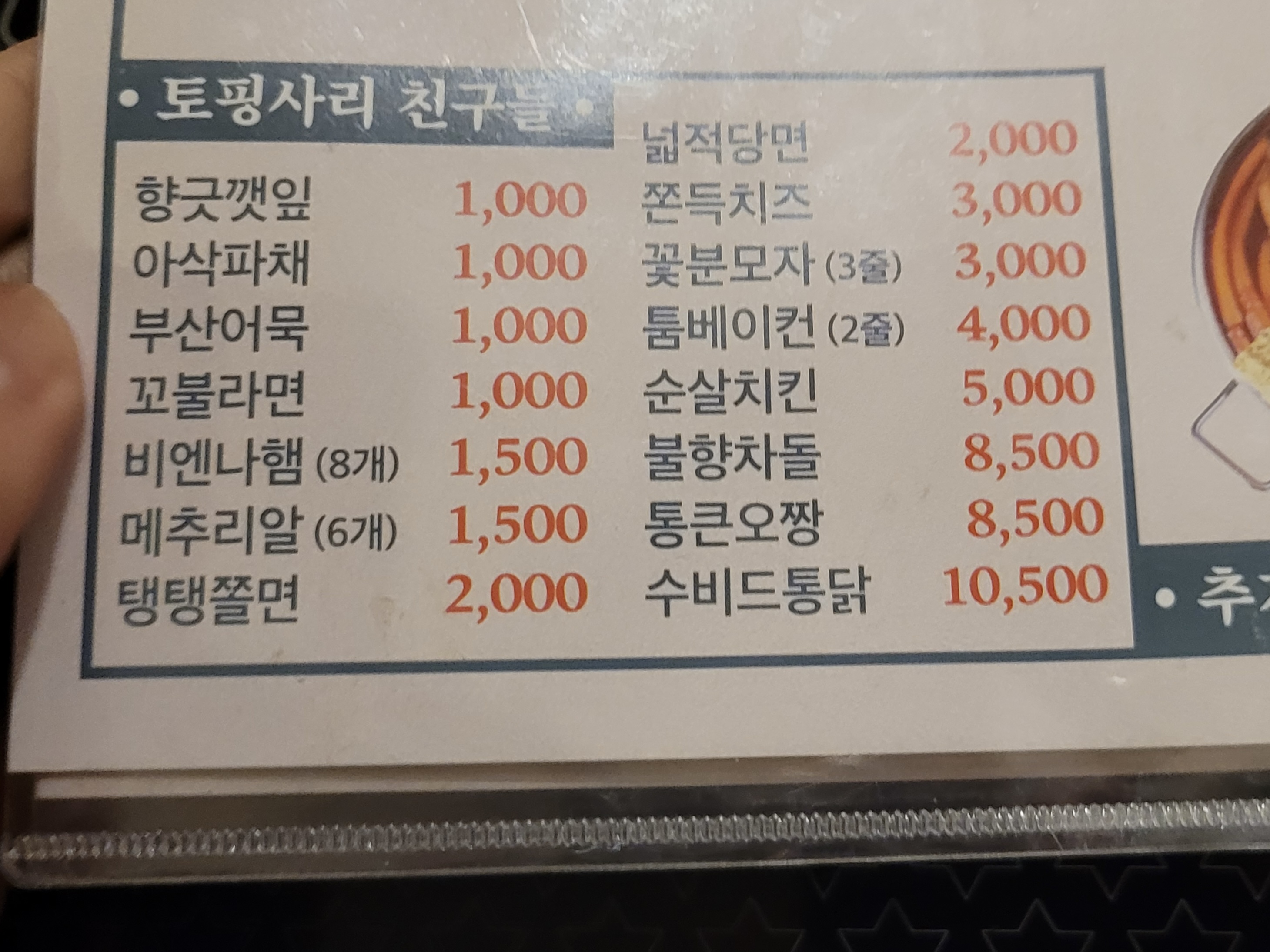 청년다방 메뉴 토핑사리 친구들 가격입니다.