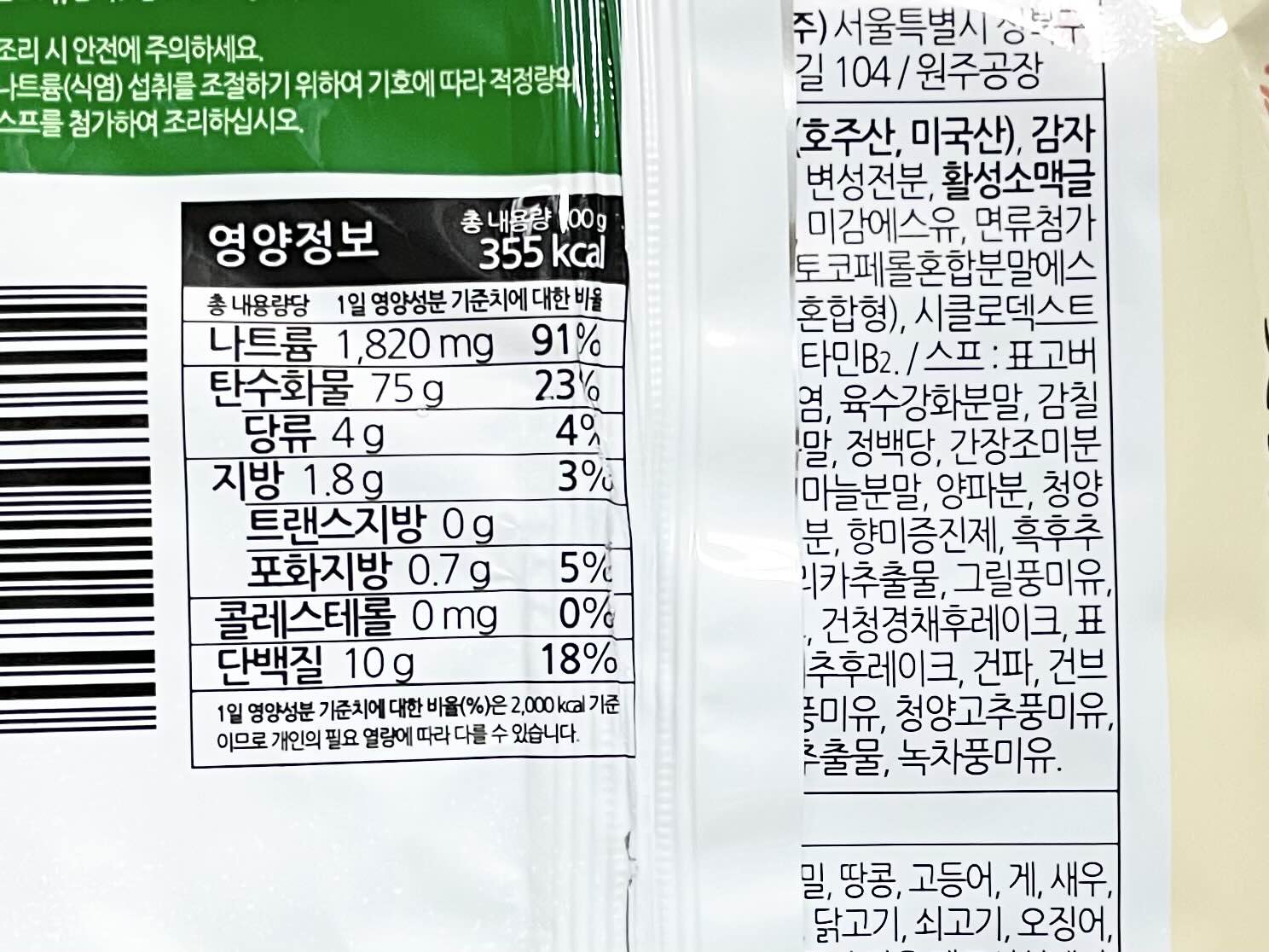 총 100g 355kcal 로 일반 라면보다 백칼로리 이상 낮습니다