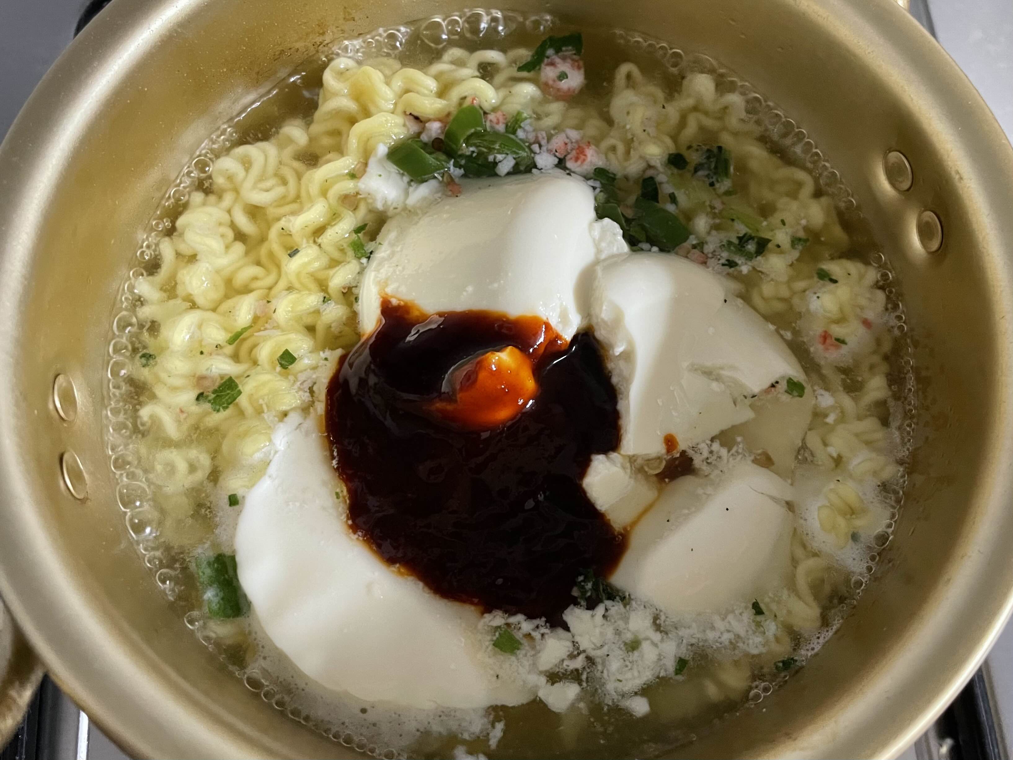 빨간 열라짬뽕 액체스프와 순두부를 넣으니 제법 그럴싸해졌습니다