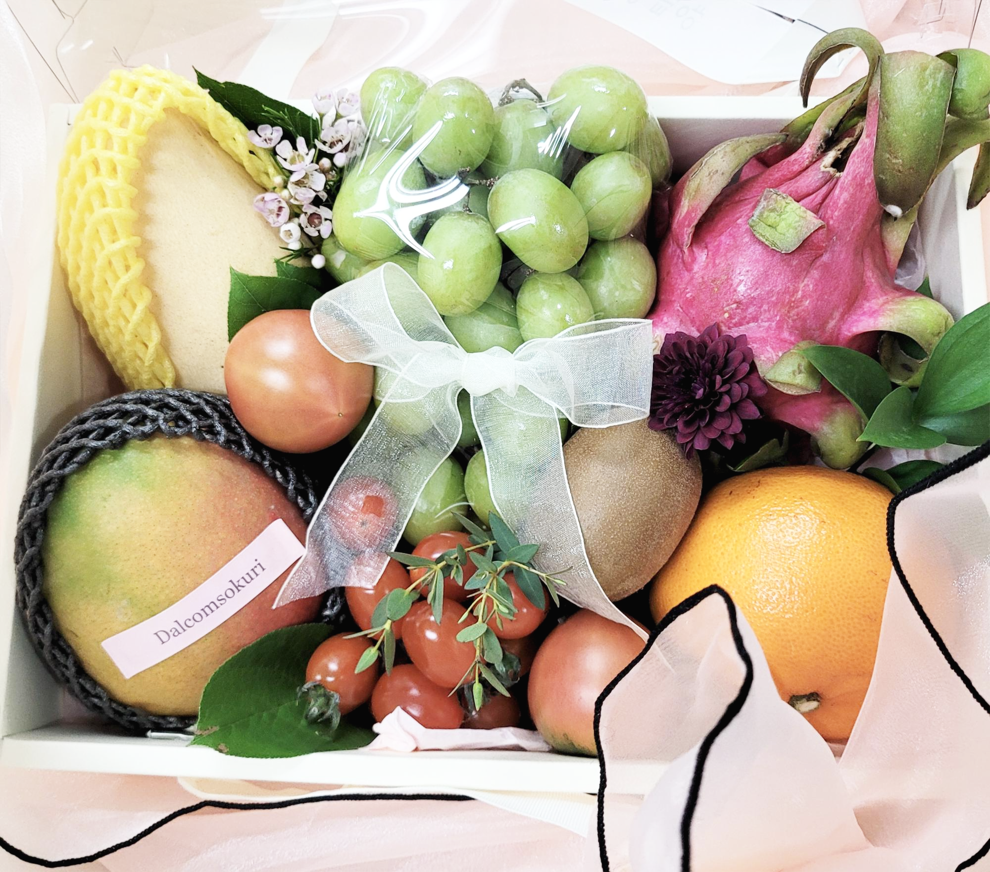 과일바구니 안에는 생화와 나뭇잎 그리고 리본으로 데코가 되있었는데 너무 예뻤습니다