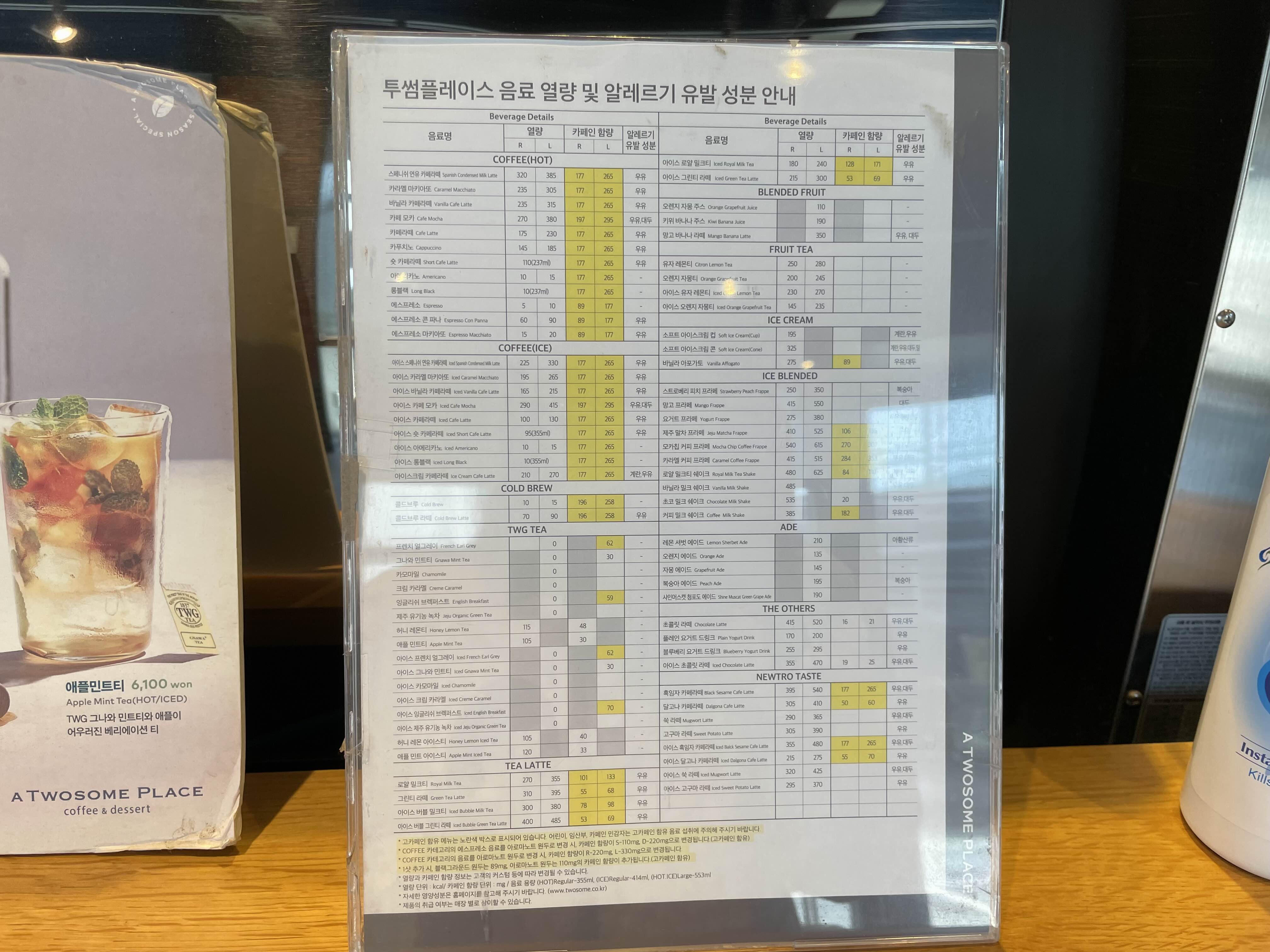 투썸플레이스 음료 칼로리와 알레르기 유발 성분 안내표 입니다.