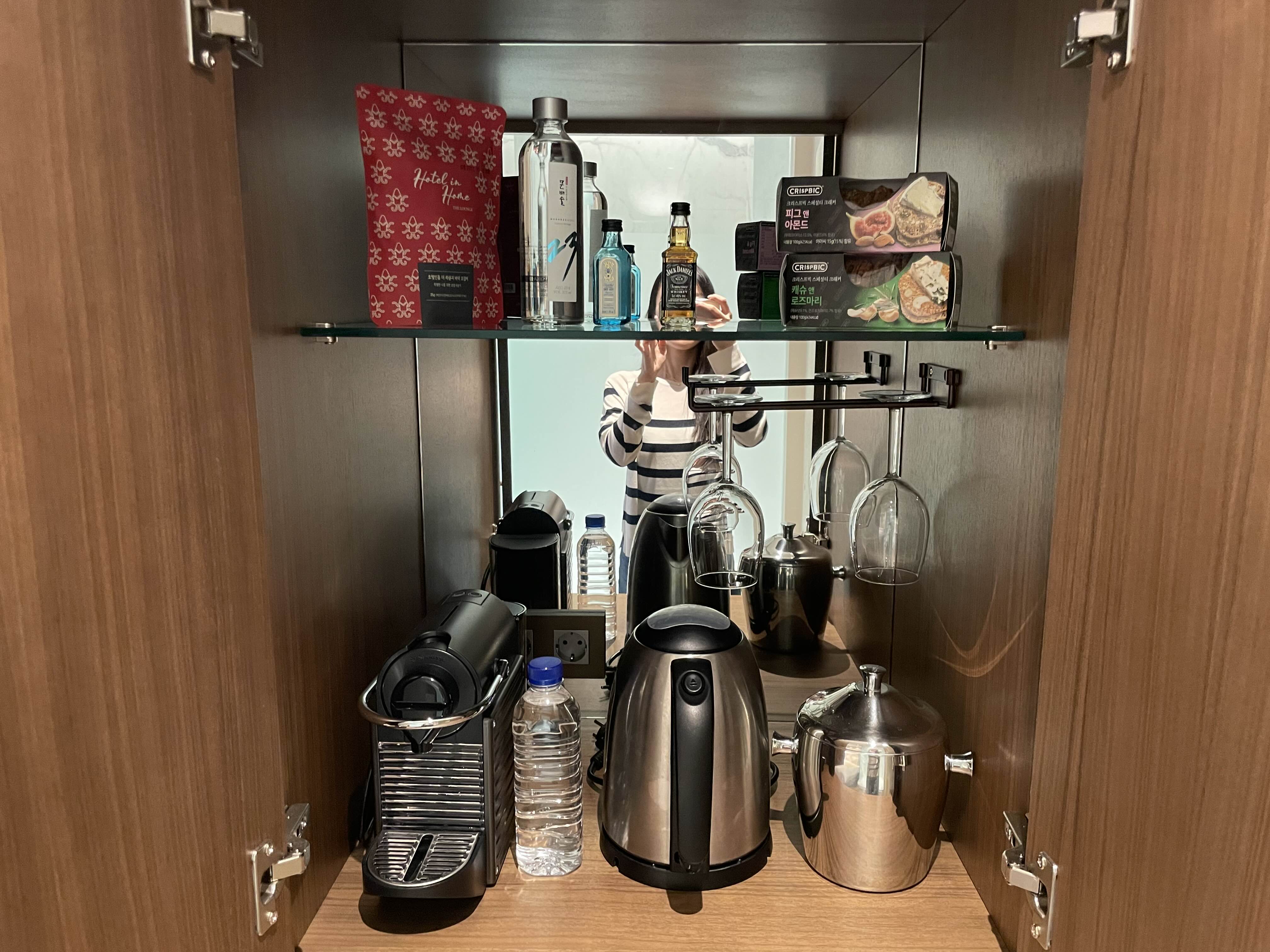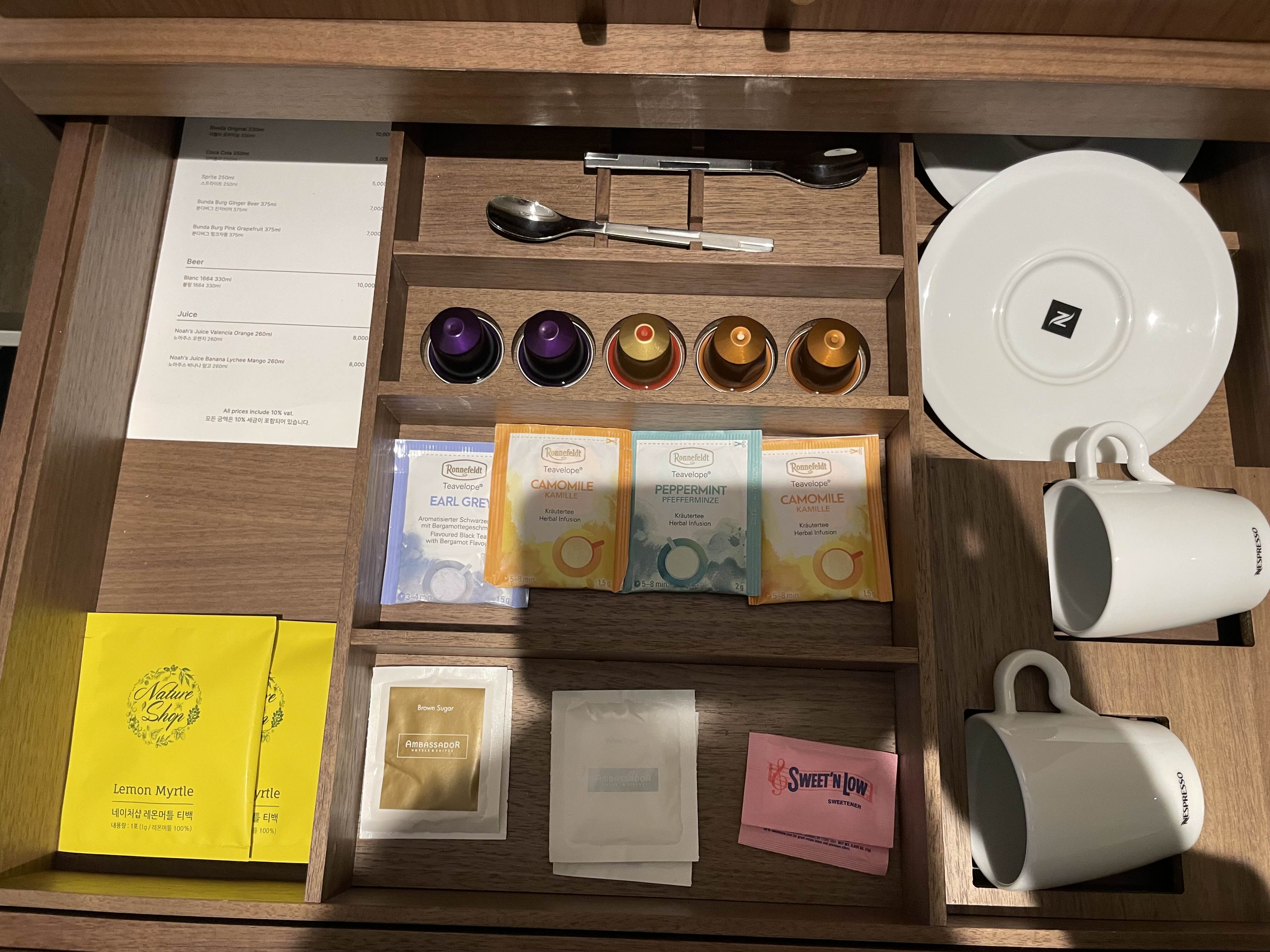 미니바에는 네스프레소 커피머신, 무료생수 2병, 커피와 차, 전기포트가 마련되어있습니다.