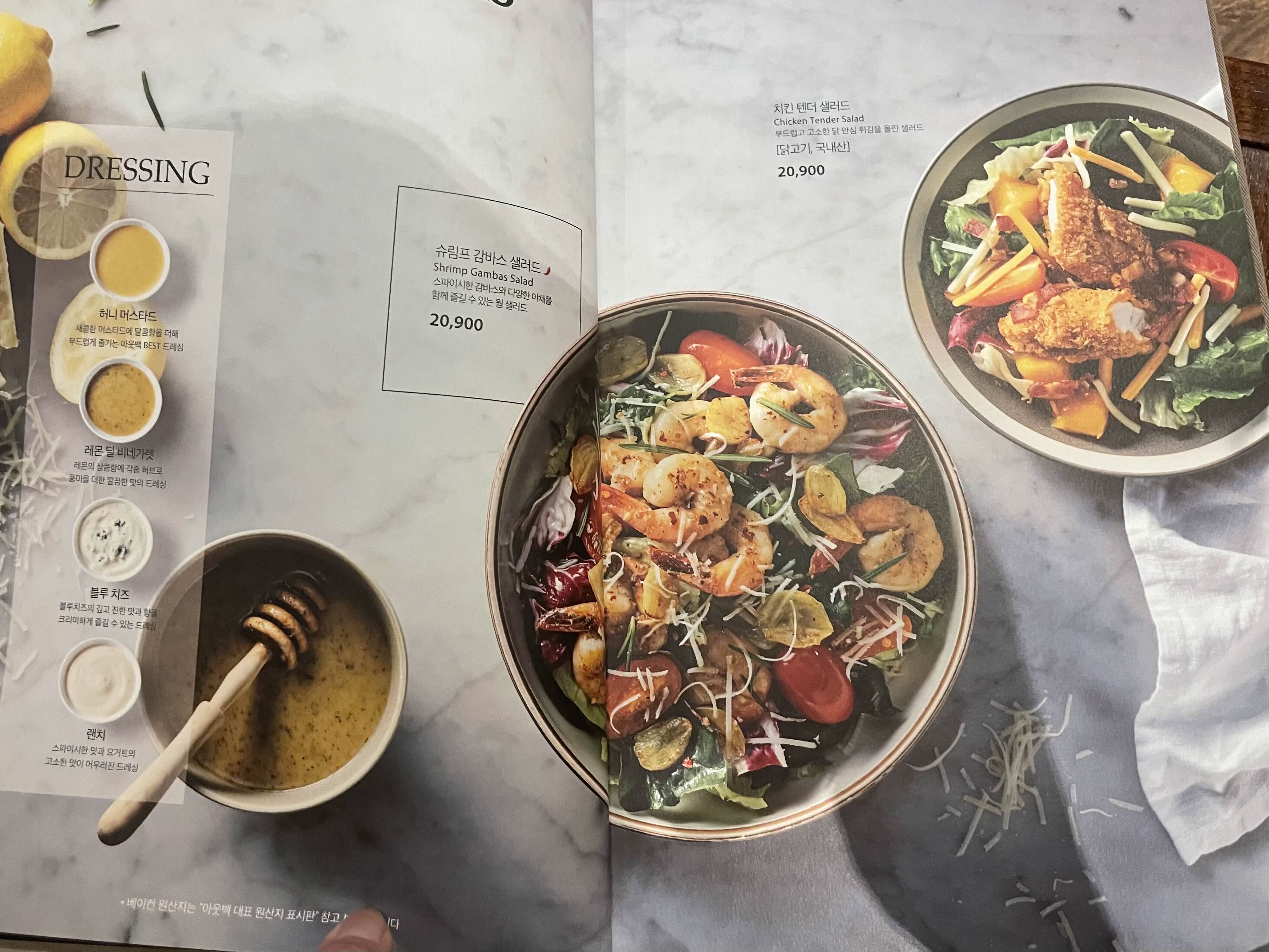 슈림프 감바스 샐러드와 치킨 텐더 샐러드 20,900원으로 비싸군요^^;...