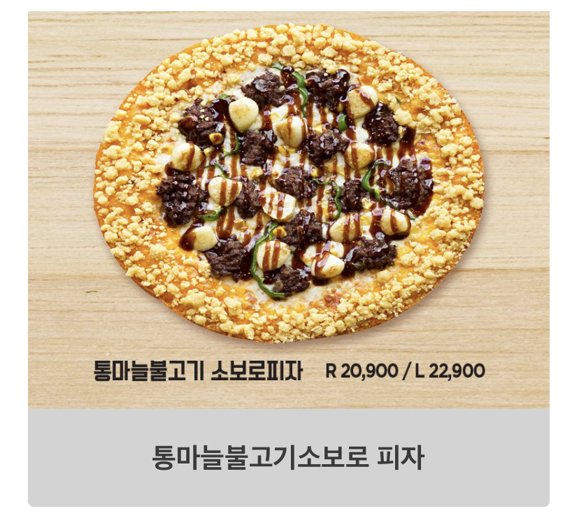 메뉴는 통마늘불고기소보로피자 레귤러사이즈 로