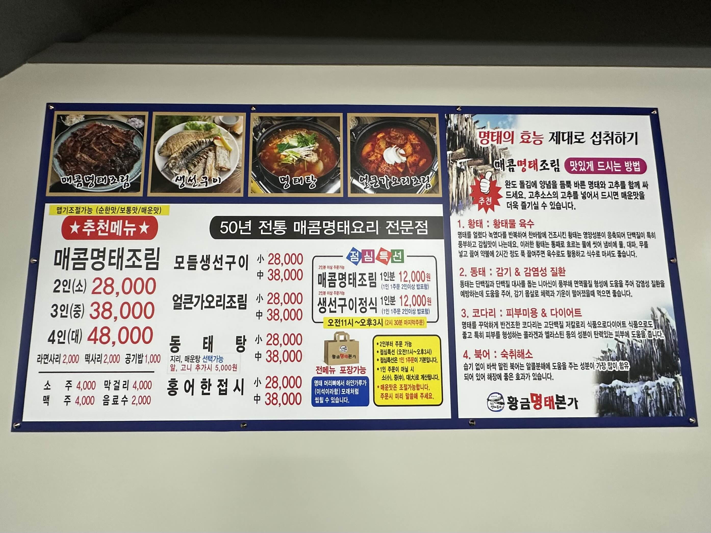 사상구 괘법동 맛집 황금명태본가 메뉴와 가격입니다