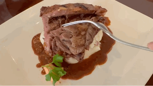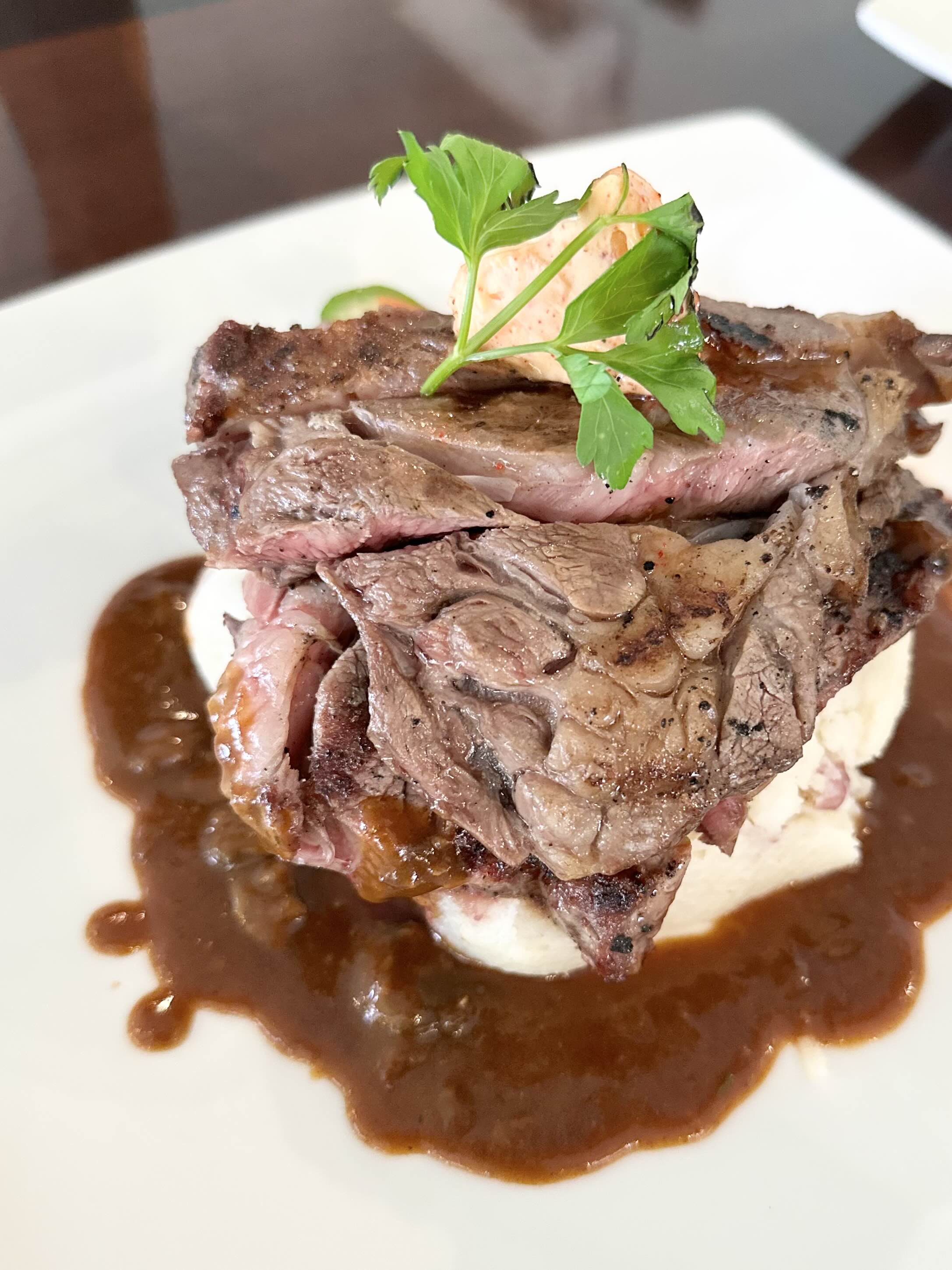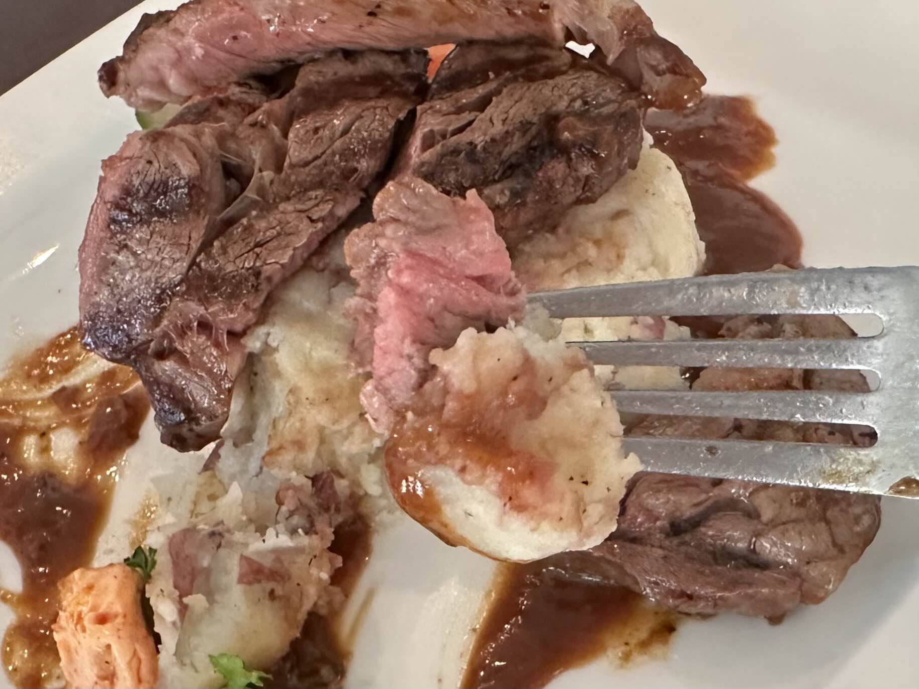 소스와 그 위에 감자퓨레 그리고 미디움으로 익혀진 스테이크입니다