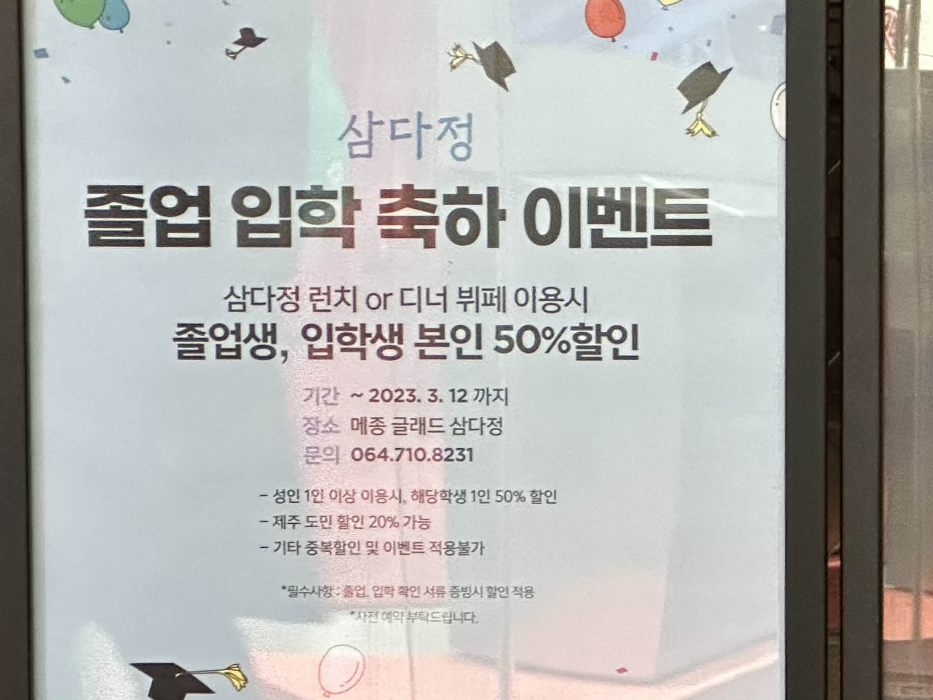 2023.3.12까지 졸업생과 입학생분들 제주 삼다정 뷔페 런치와 디너 이용시 무려 50% 나 할인된다고 하는군요!