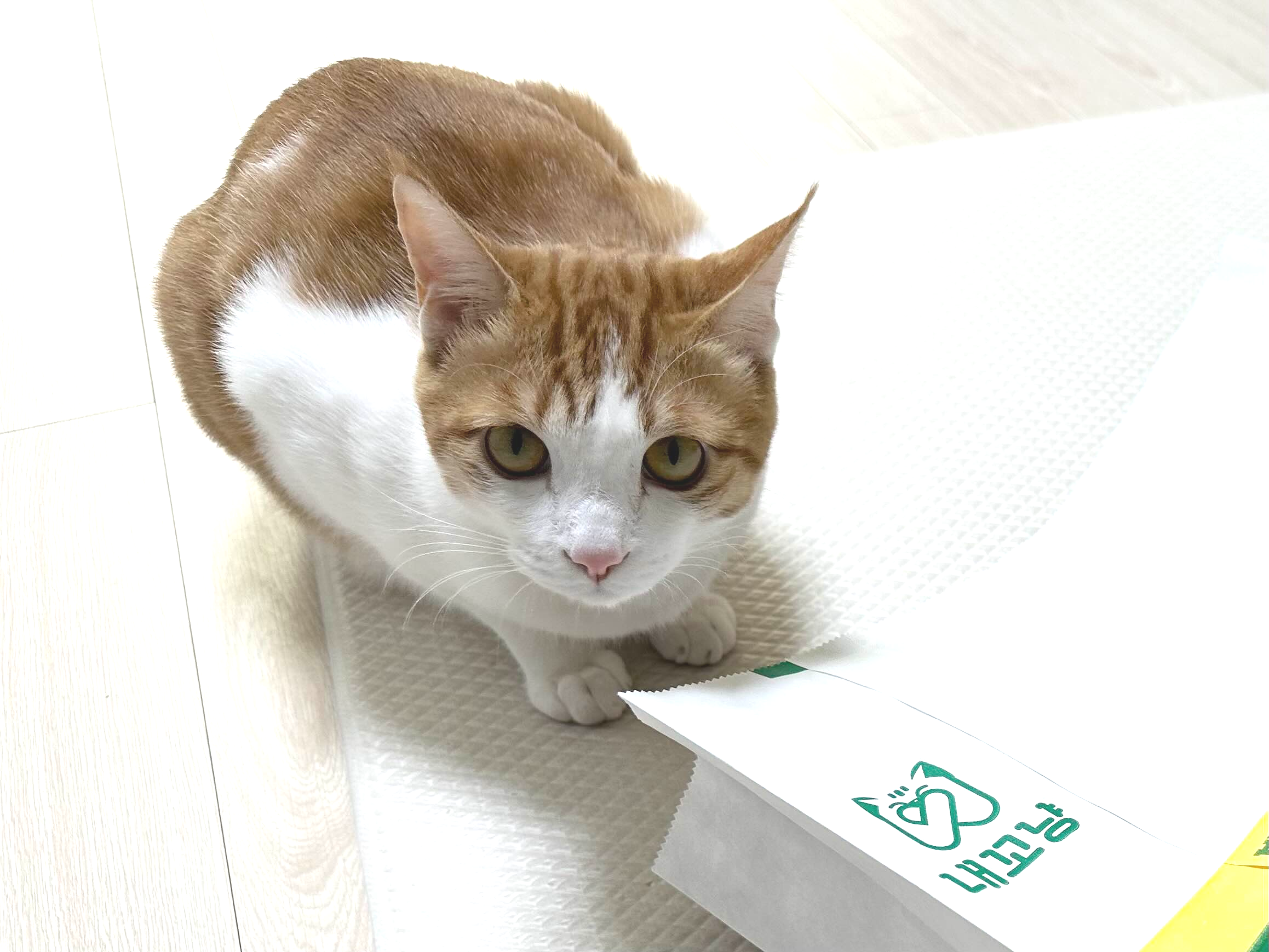 종이봉투의 바스락 거리는 소리가 고양이의 호기심을 불러일으키는 것 같습니다