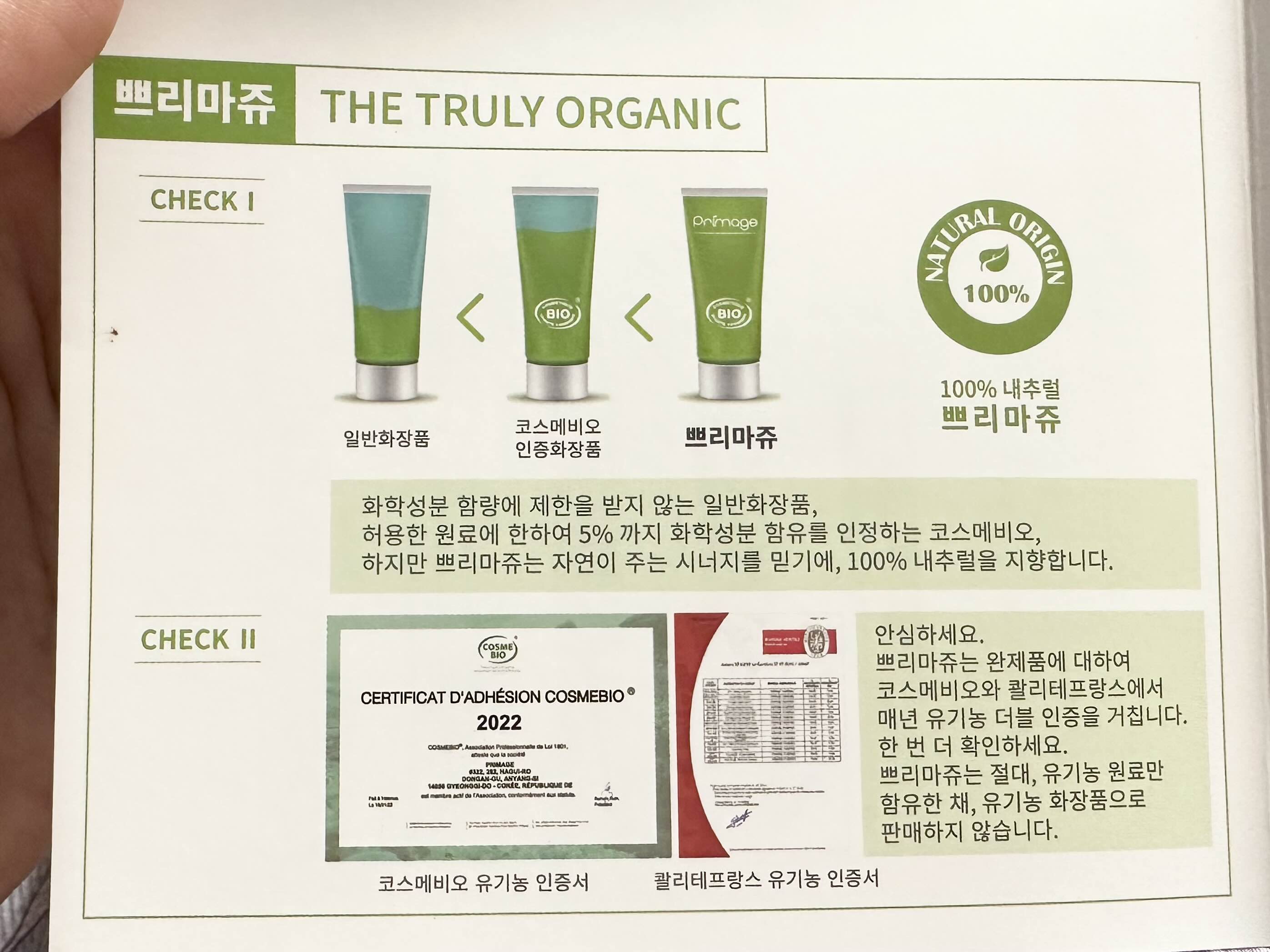 쁘리마쥬는 유기농 인증원료 함유는 물론 완제품 및 제조공장까지 유기농 인증을 받았습니다