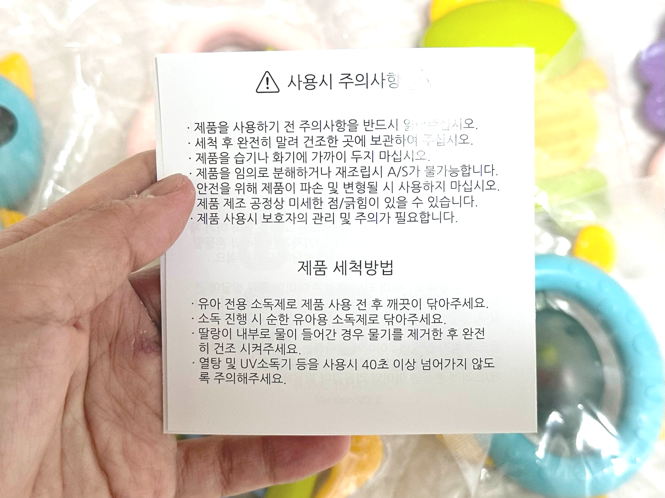 열탕소독되는 아기 딸랑이 제품 세척 시 주의사항입니다