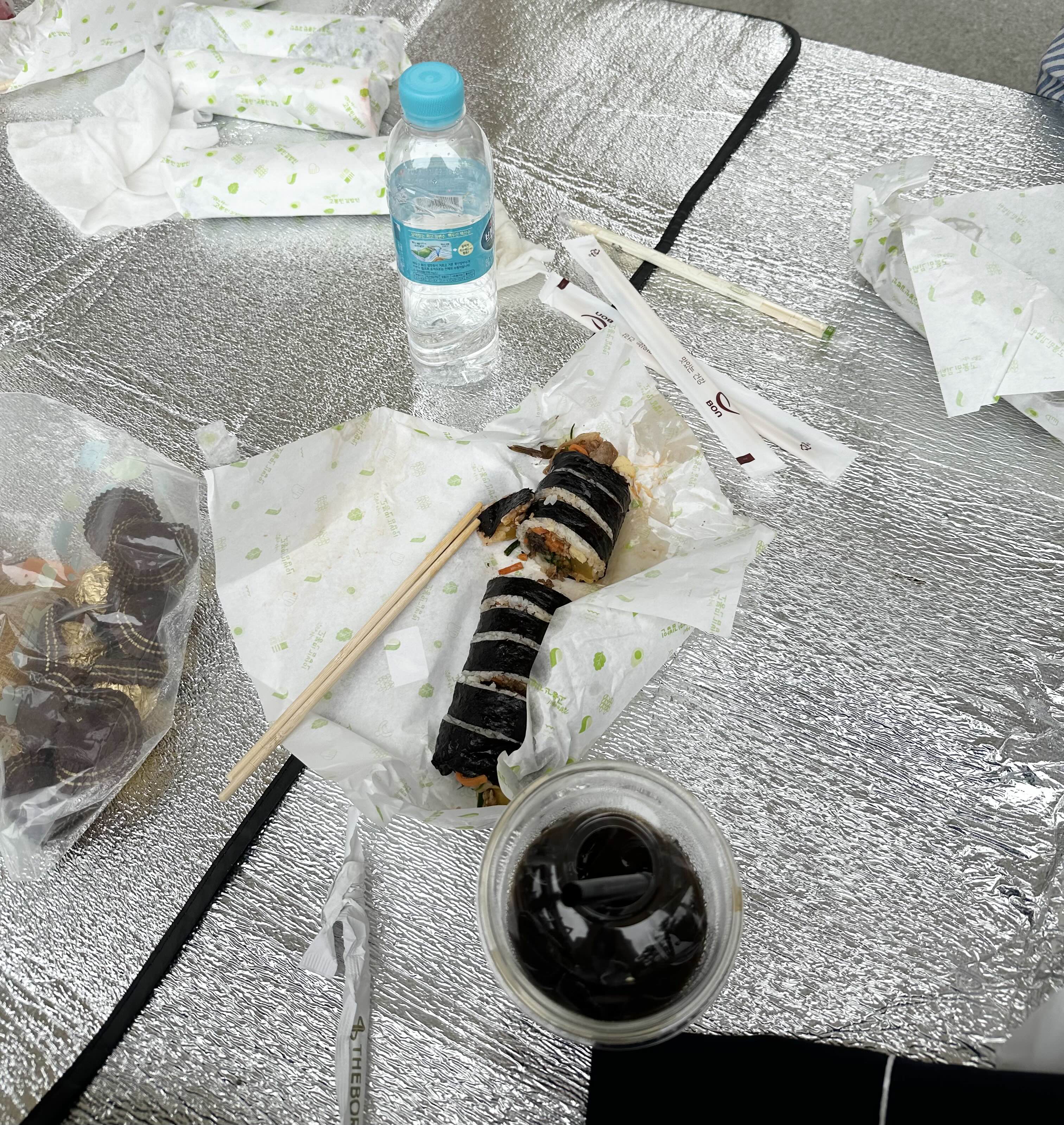 저희는 고봉민 김밥, 후식은 초콜릿과 빵,자두 같은 주전부리로 해결했습니다