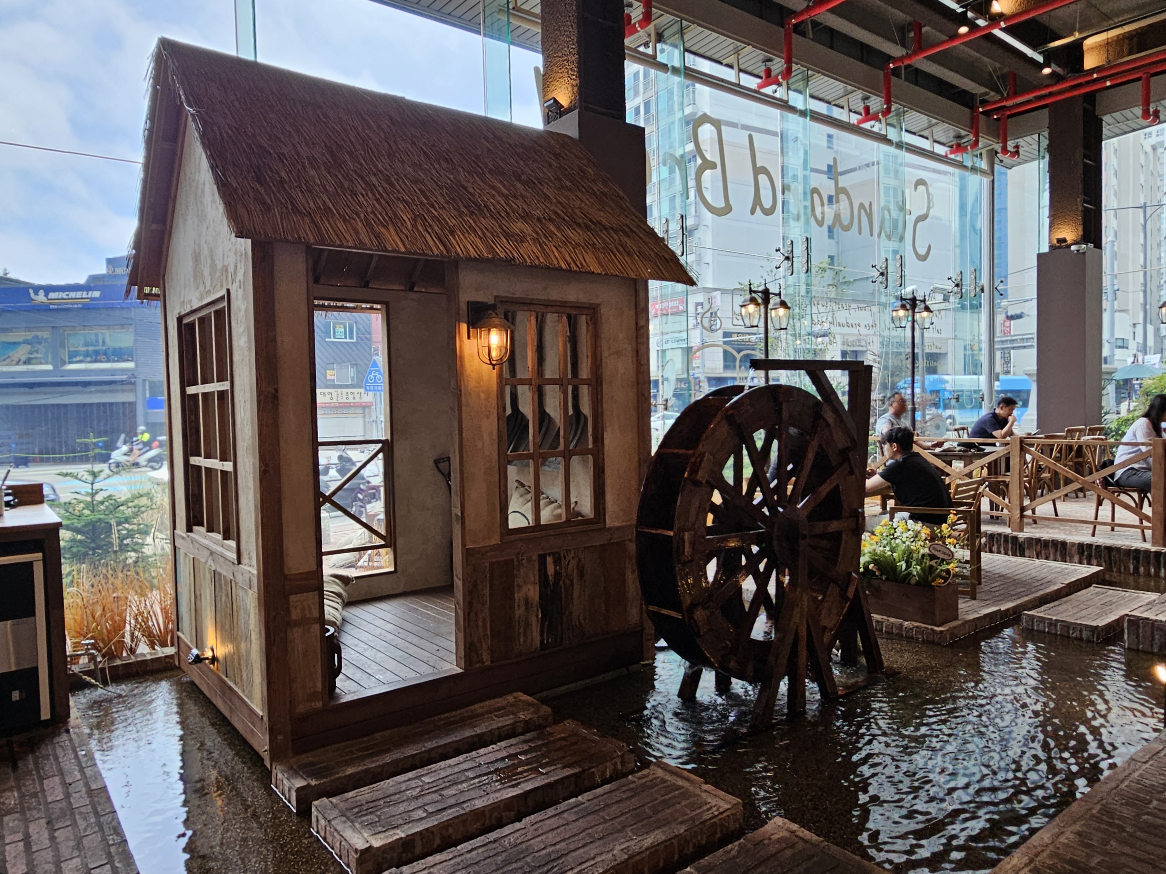 매장 한 가운데 떡하니 물레방아가 돌아갑니다