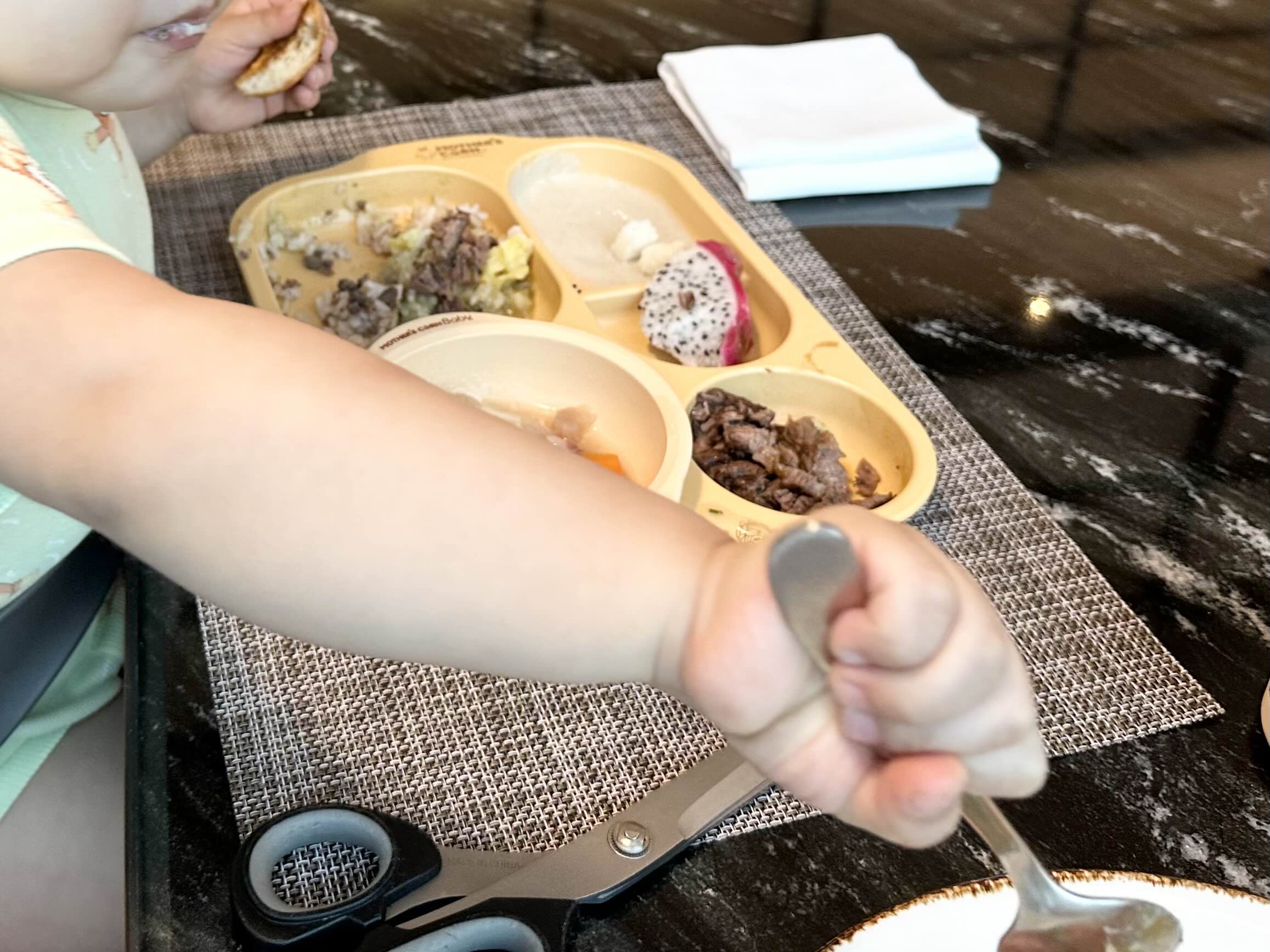 아기는 만두와 게살죽, 스프, 갈비, 미니햄버거, 모닝빵 등 엄청 먹었습니다