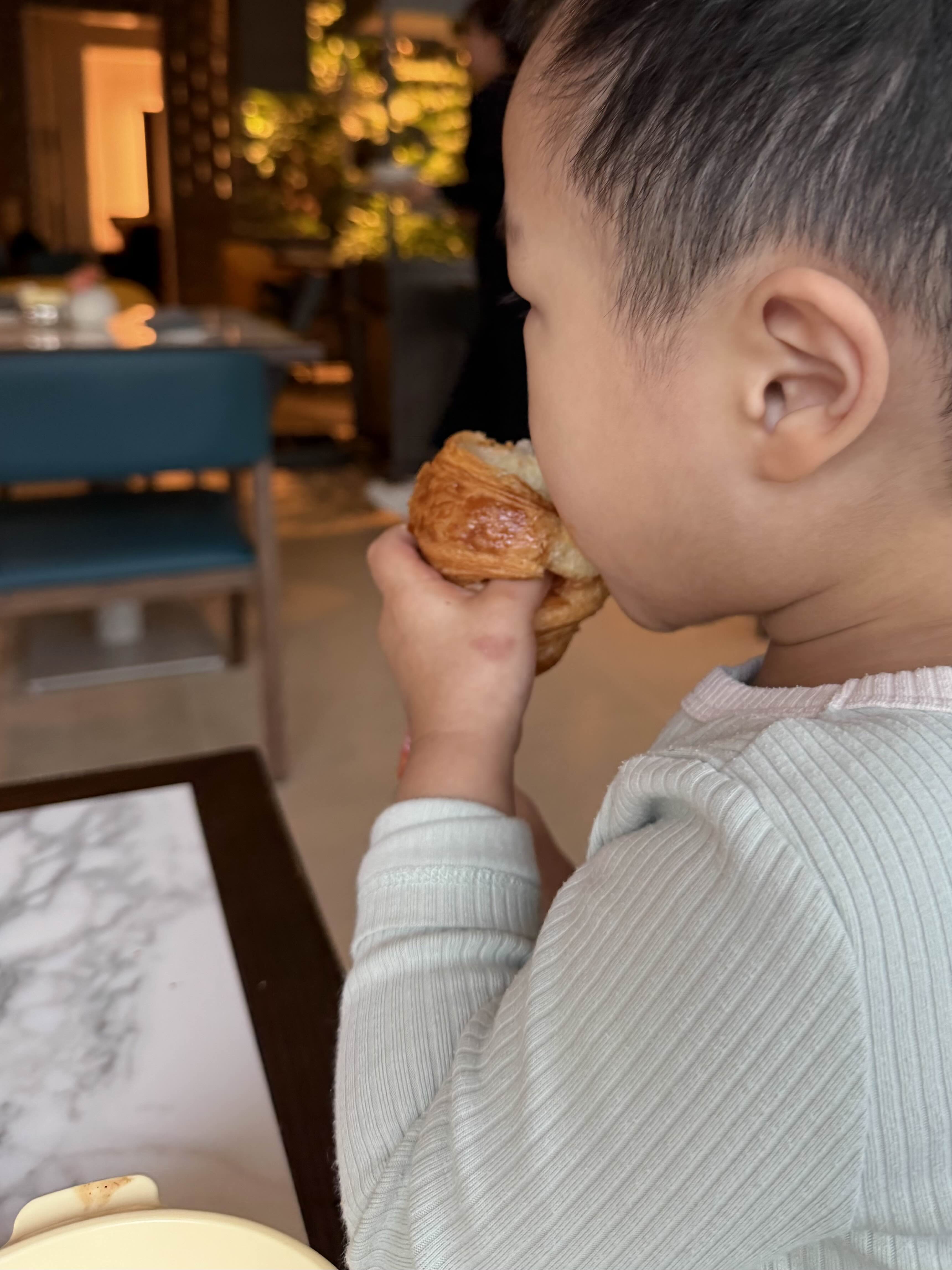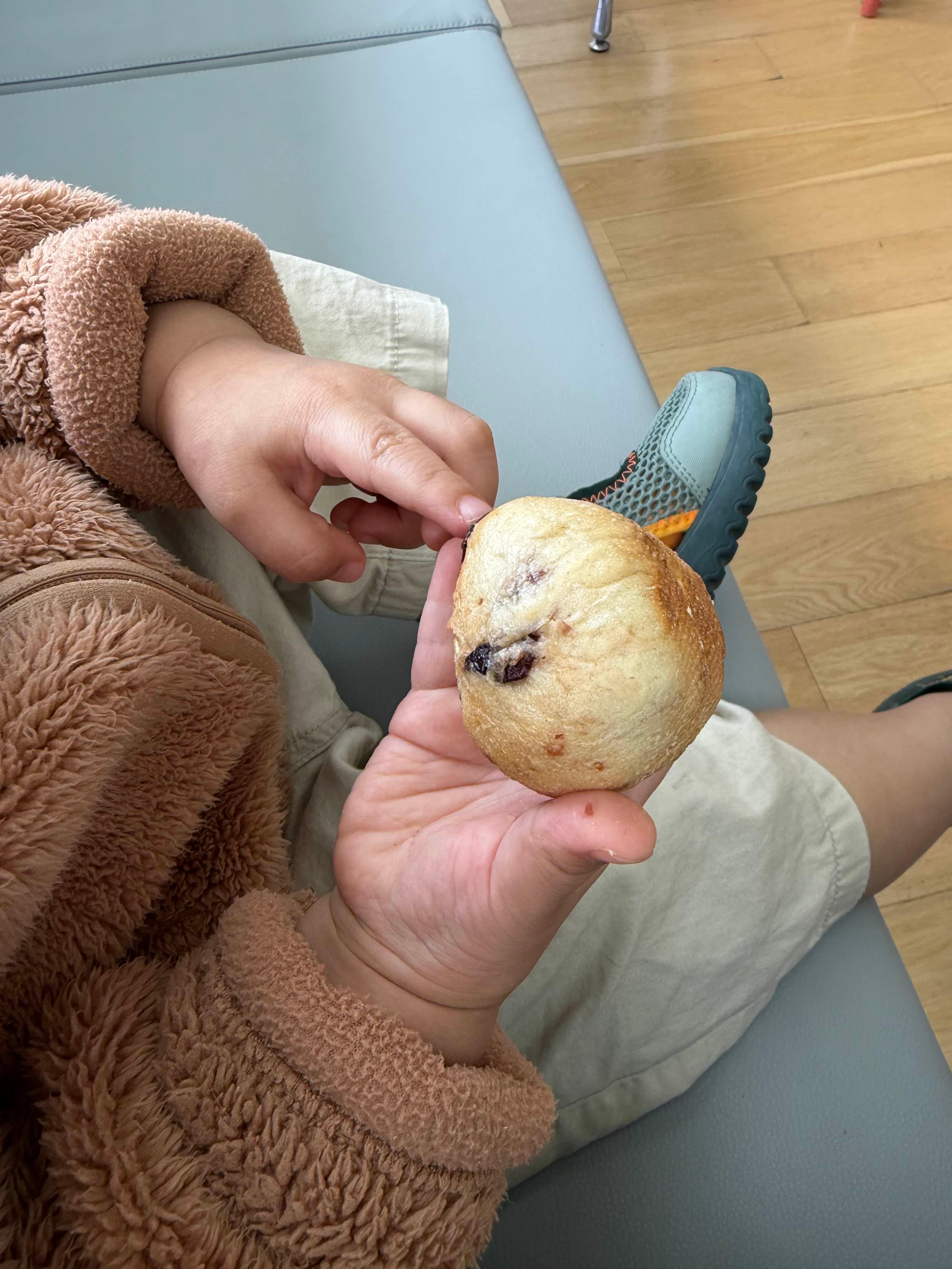 내 크루아상까지 스틸하고 나가기 전엔 건포도 빵까지 낭낭히 들고 나온 아기