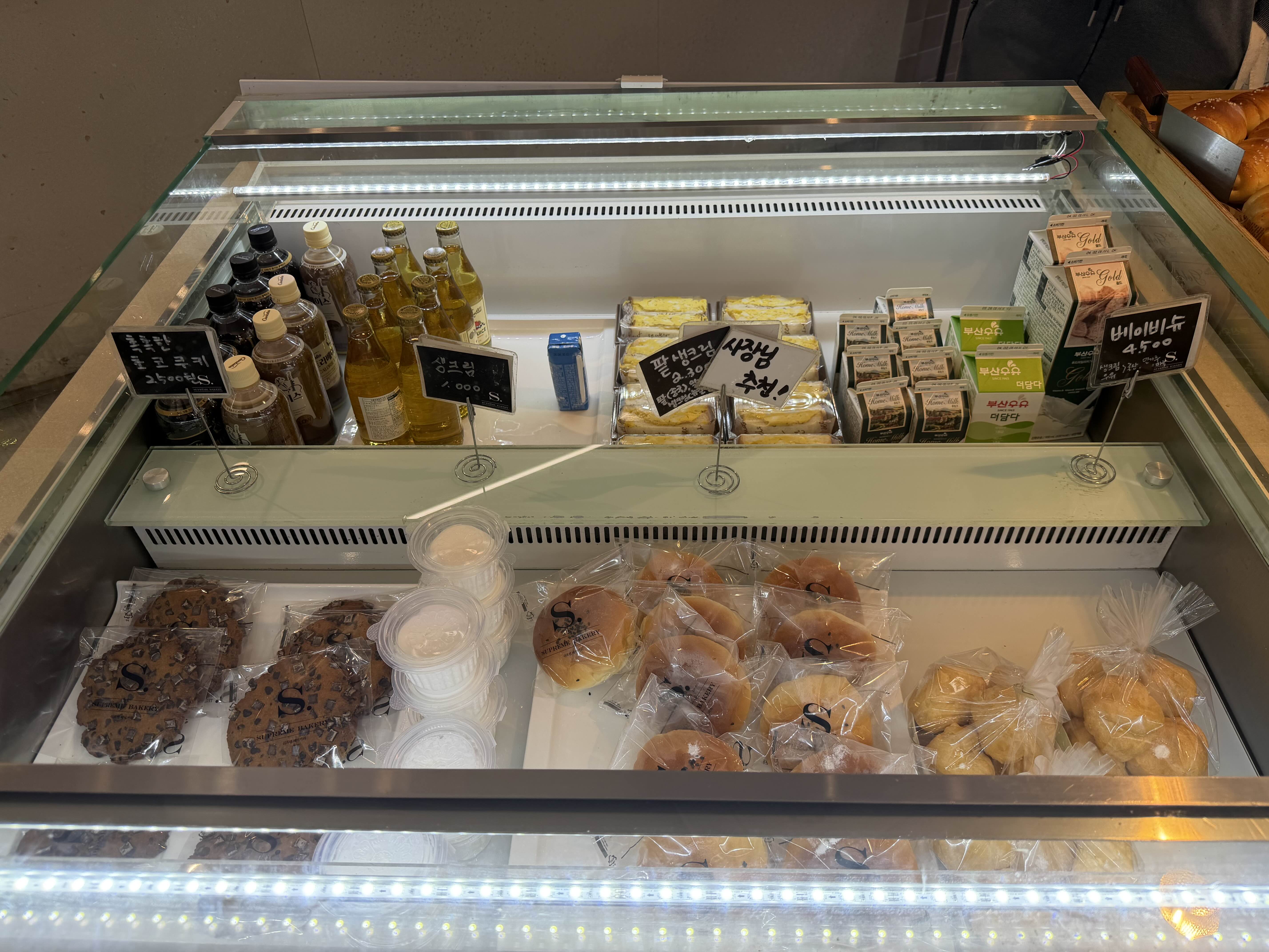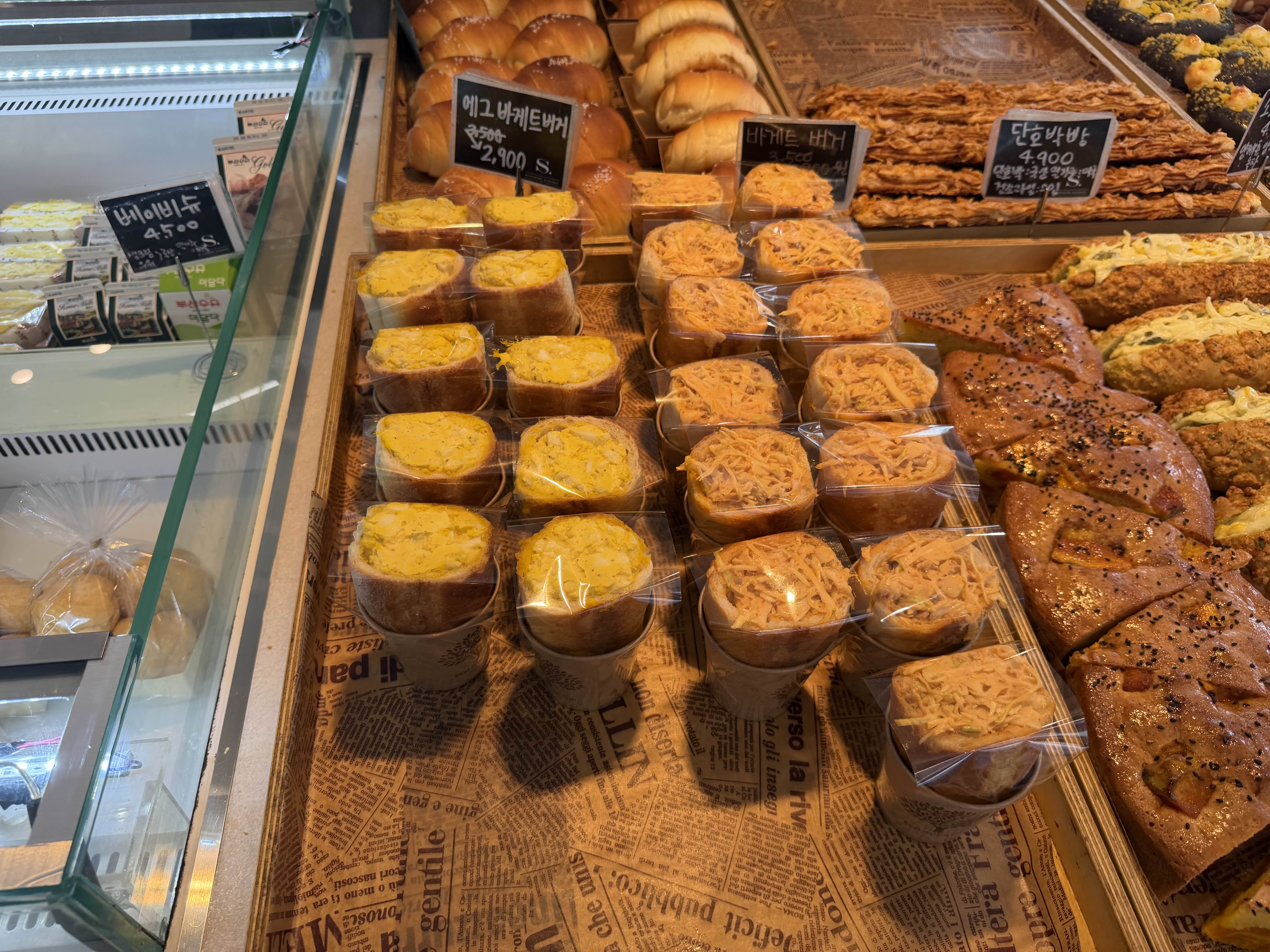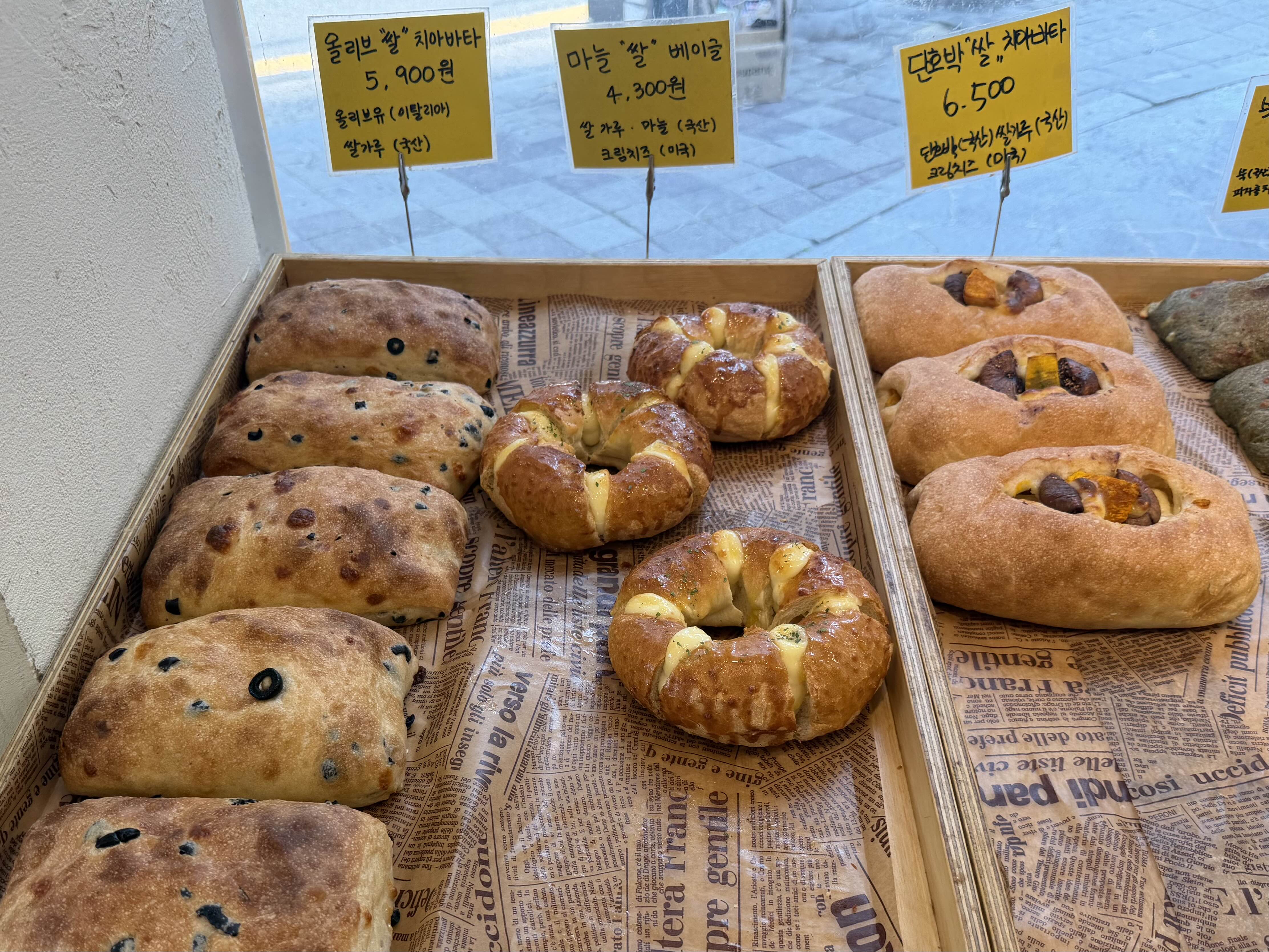 창문 너머로 가득 채워진 빵들을 보고 있자니, 그냥 지나칠 수가 없어서 볼일을 재빠르게 마치고 잽싸게 들어왔습니다.