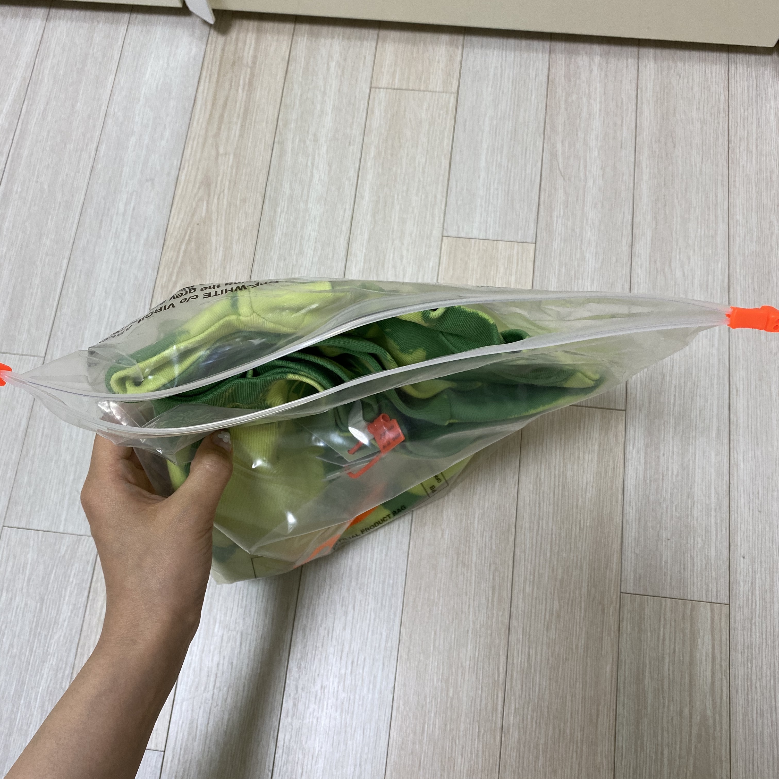 개인적으로 오프화이트(Off White) 타이다이 반팔 티셔츠에 담겨온 지퍼백은 재활용해도 유용할 것 같습니다.
