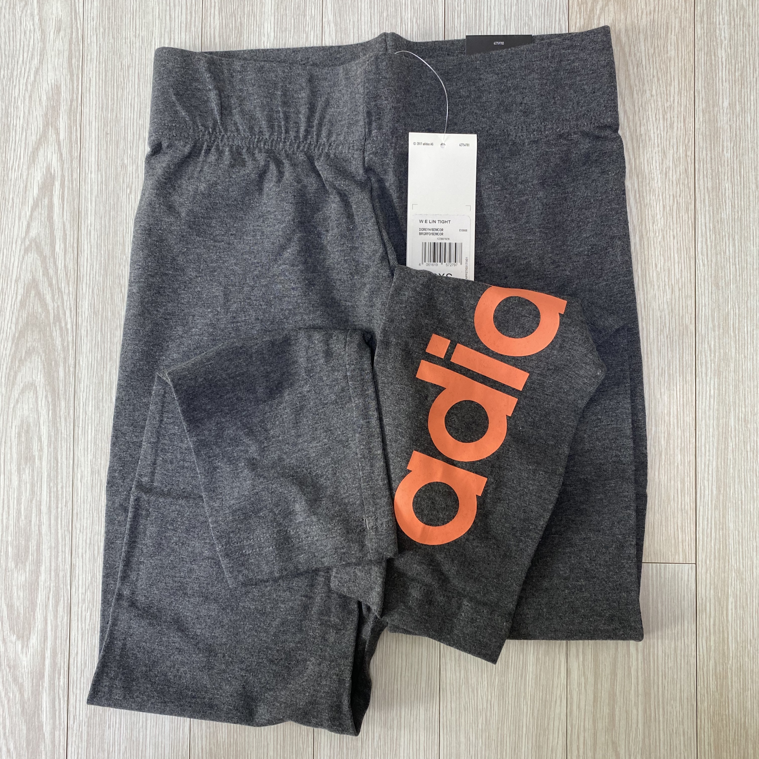 오렌지 컬러로 adidas 가 새겨져 있는 심플한 레깅스입니다.