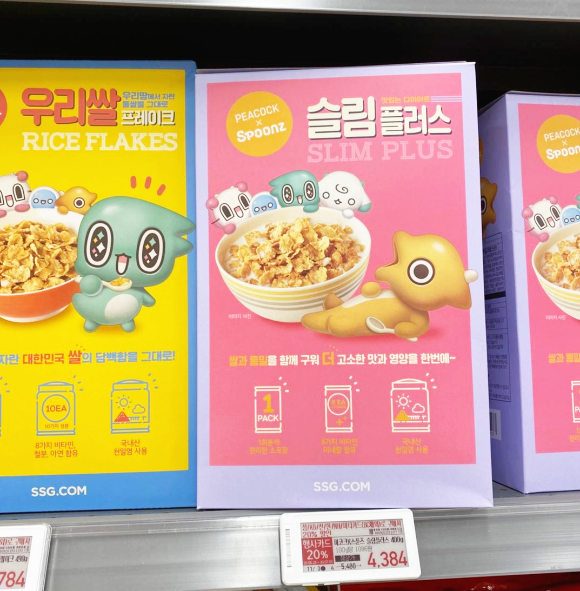 이마트 시리얼코너에 있는 PEACOCK x SPOONS 입니다. 행사가격 4,384원에 구매하였고 슬림플러스 말고도 귀여운 캐릭터별로 시리즈가 다양하게 있습니다.