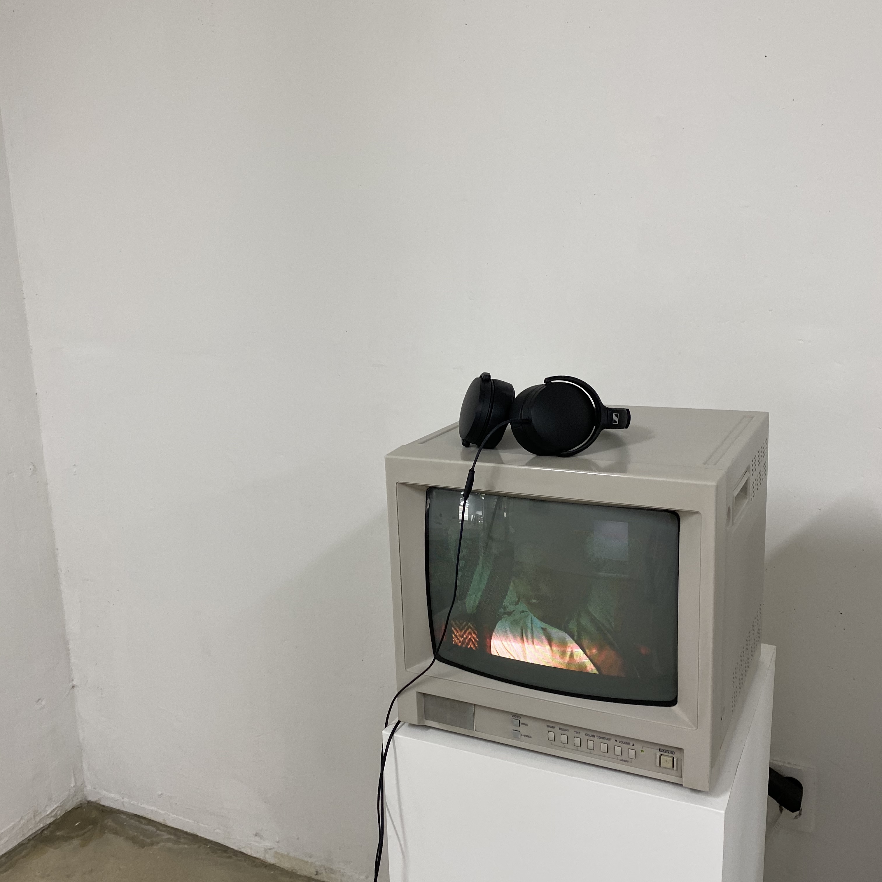 전시되있는 티비 한대와 헤드셋이 있습니다.